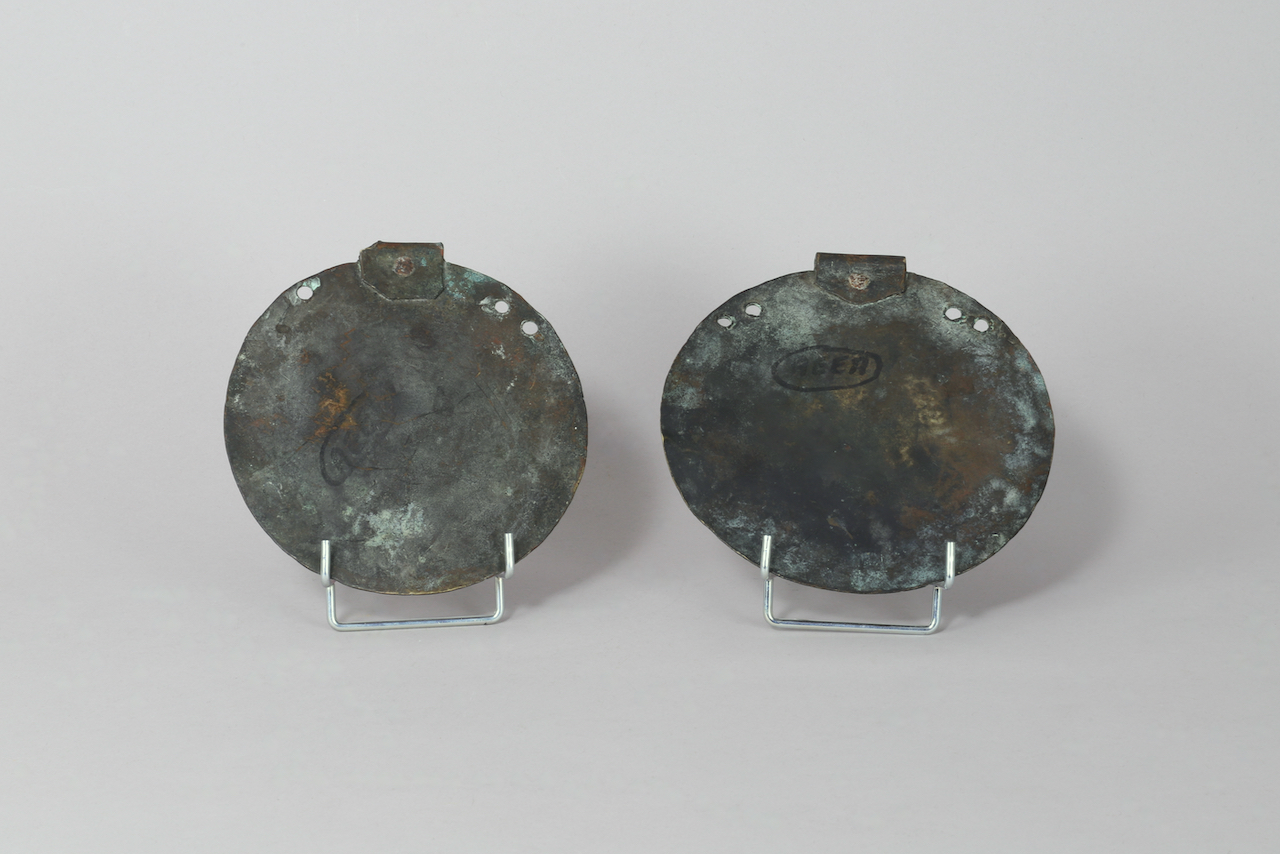 Deux plaques muletières en laiton, XVIIIe siècle. Elles présentent un même décor gravé avec un aigle inscrit dans un médaillon, lui-même entouré d’un couple d’aigles et surmonté d’une couronne.