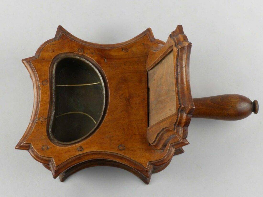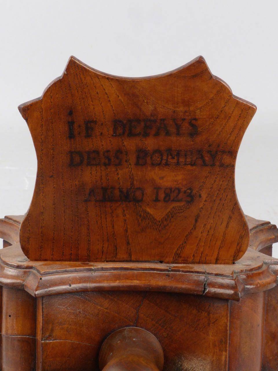 Une sébile (objet de quête) en bois fruitier réalisé vers la fin du XVIIIe siècle ou au début du XIXe siècle. Muni d’un manche en bois tourné, il se compose d’un corps chantourné sur monté d’un petit écran en biais pour une image pieuse et d’un petit bassin pour la quête. Au revers de l’écran, figure la mention « I:F: DEFAYS DESS : BOMBAY ANNO 1823 ».