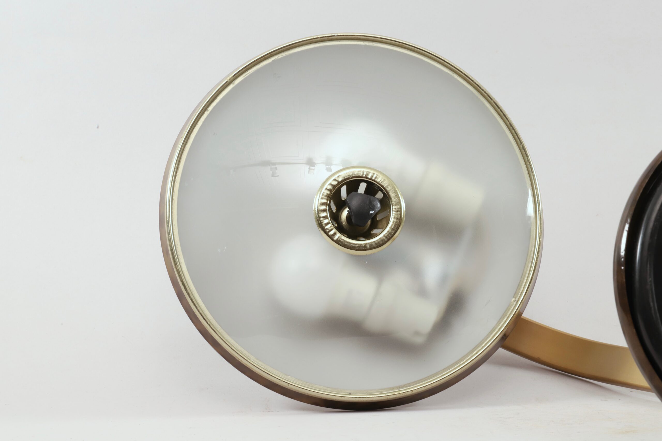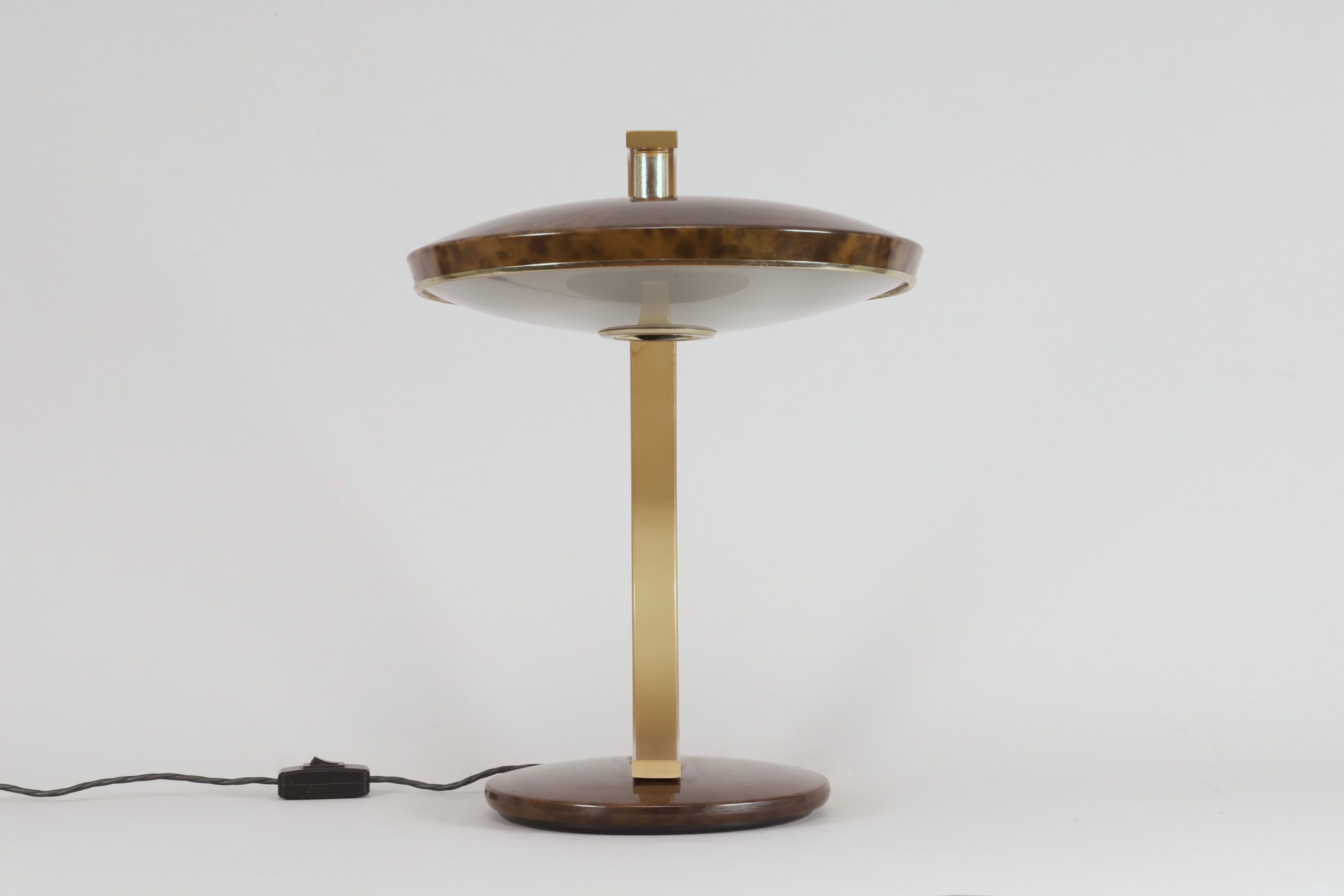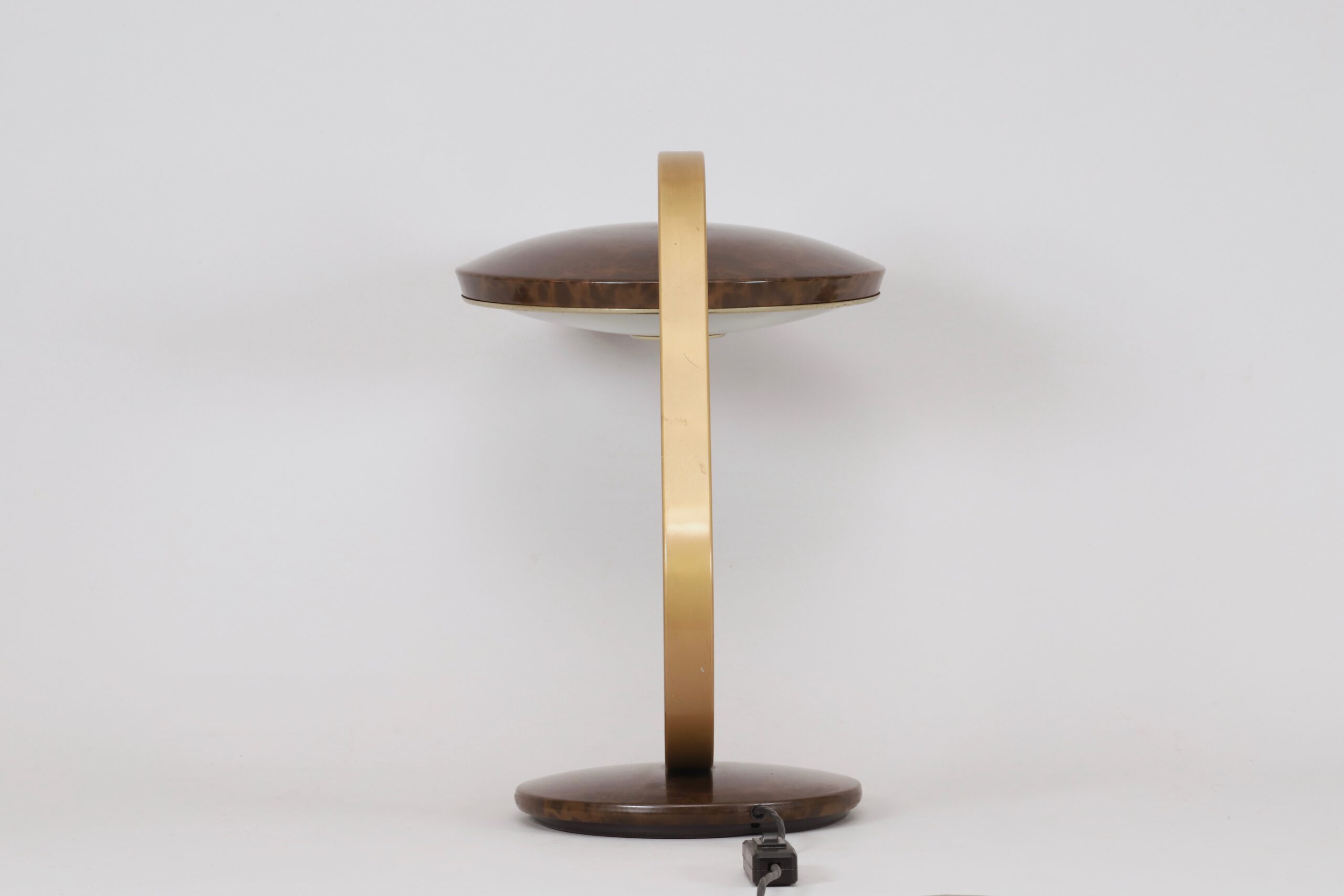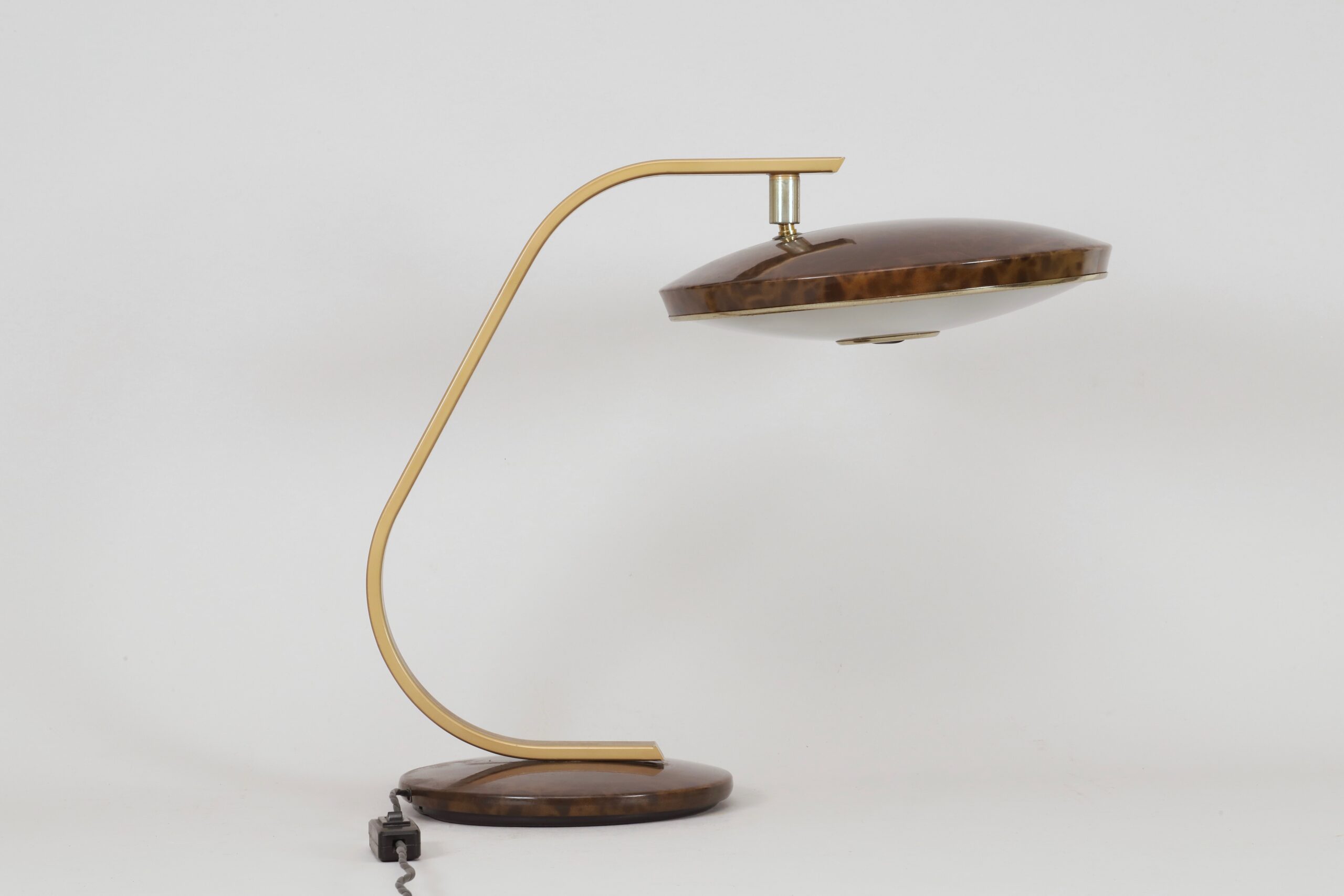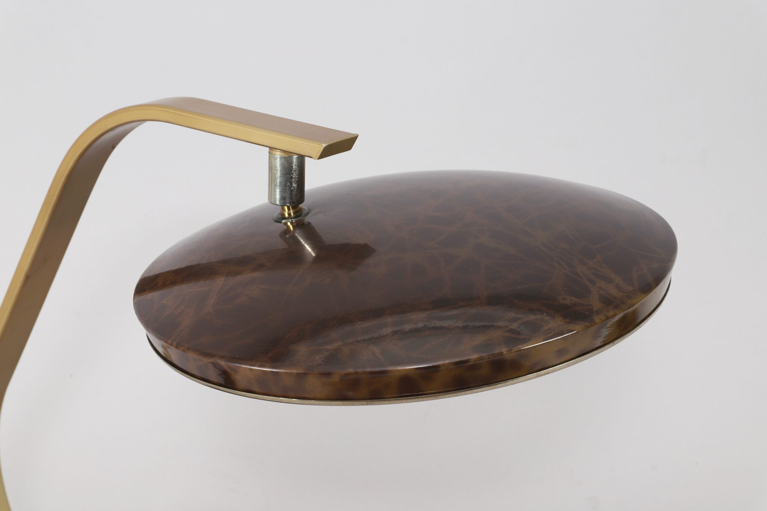 Une lampe de bureau produite par l’entreprise espagnole Fase entre 1964 et 1998. Elle est composée d’un pied pivotant et d’un abat-jour, tous deux présentant un revêtement à imitation d’un cuir marron, et d’un bras en métal doré mat. Il s’agit du modèle 520 conçu par Luis Perez de la Oliva.