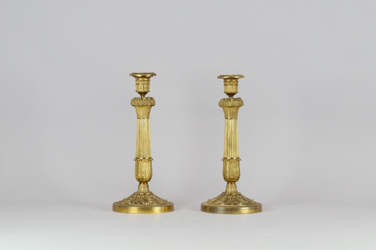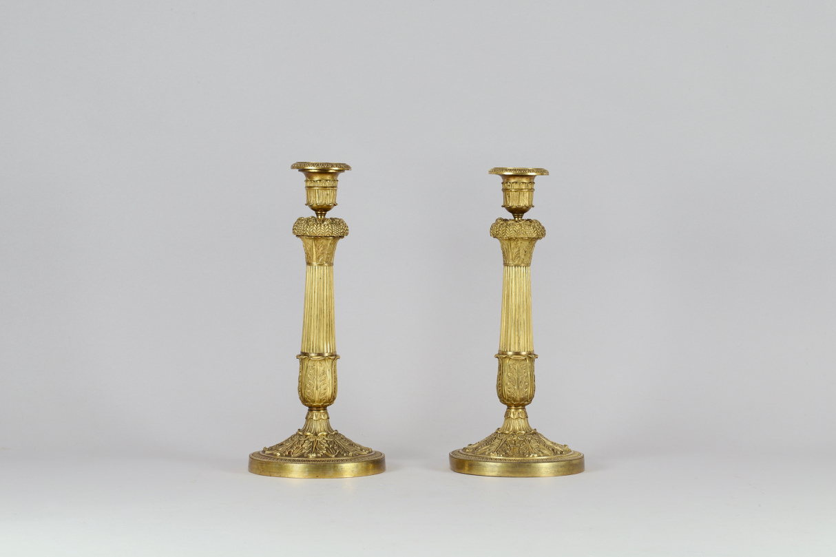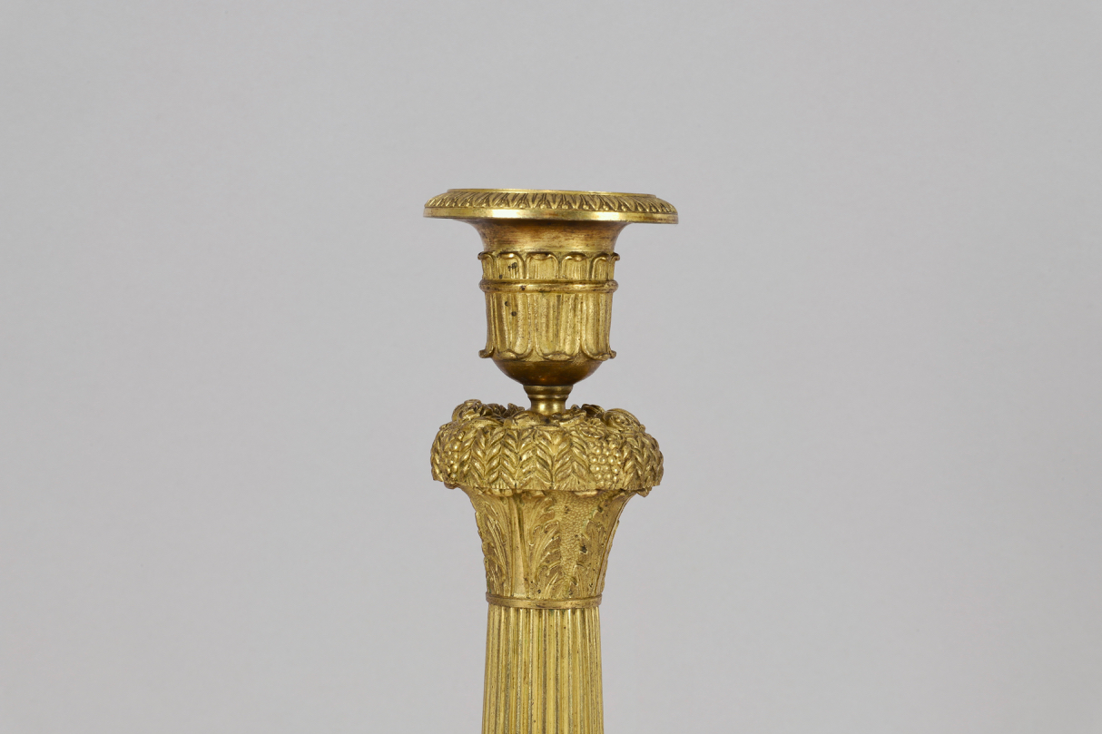 Une paire de flambeaux en bronze doré de style Empire, réalisés vers 1810-1820. Chaque flambeau est posé sur un pied circulaire décoré de bas-reliefs avec palmettes et entrelacs. La structure est prolongée par un fût cannelé de forme balustre surmonté d’une corbeille avec des grappes et épis de blé. Le binet et sa bobèche complètent l’ensemble.
