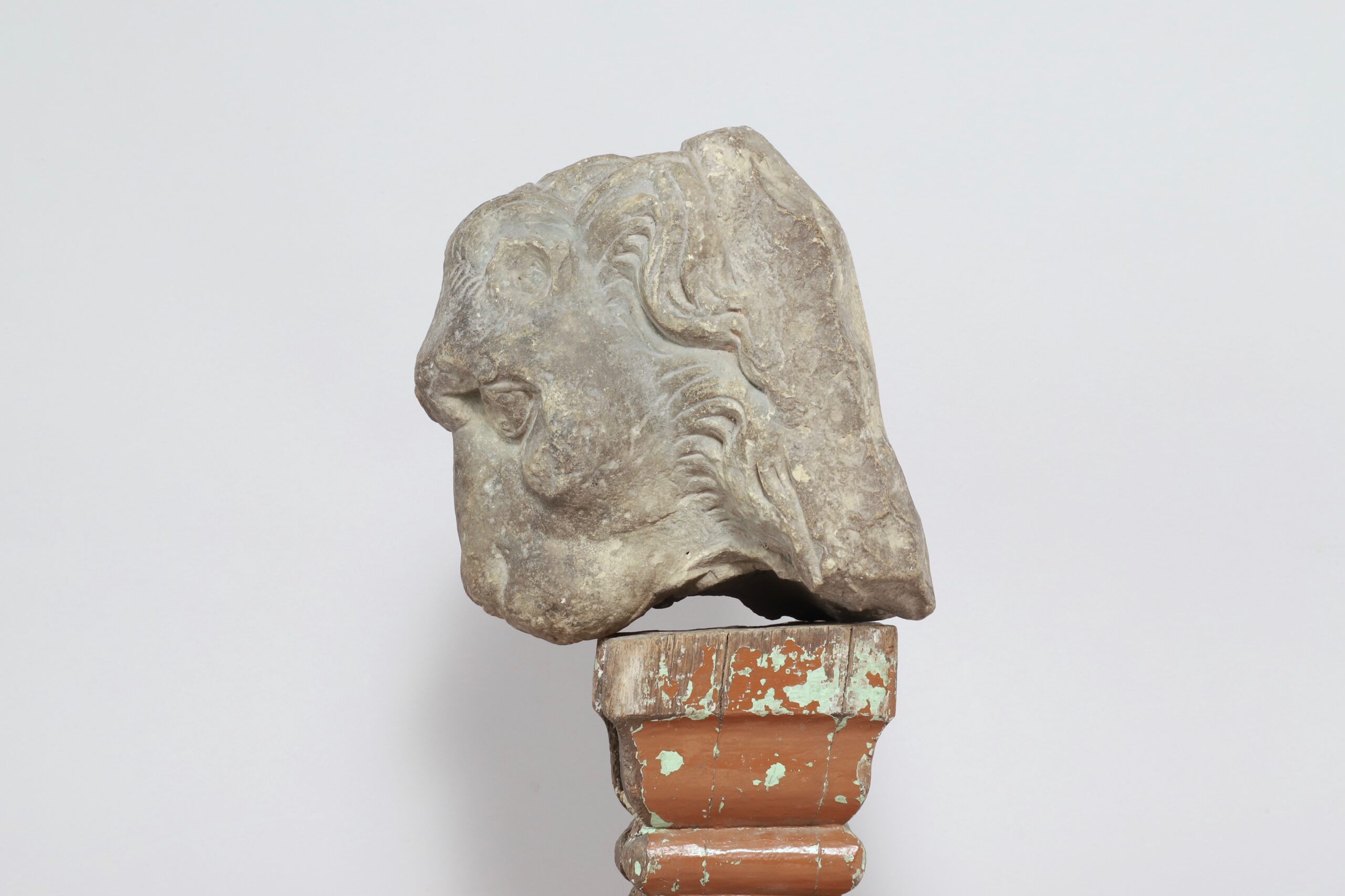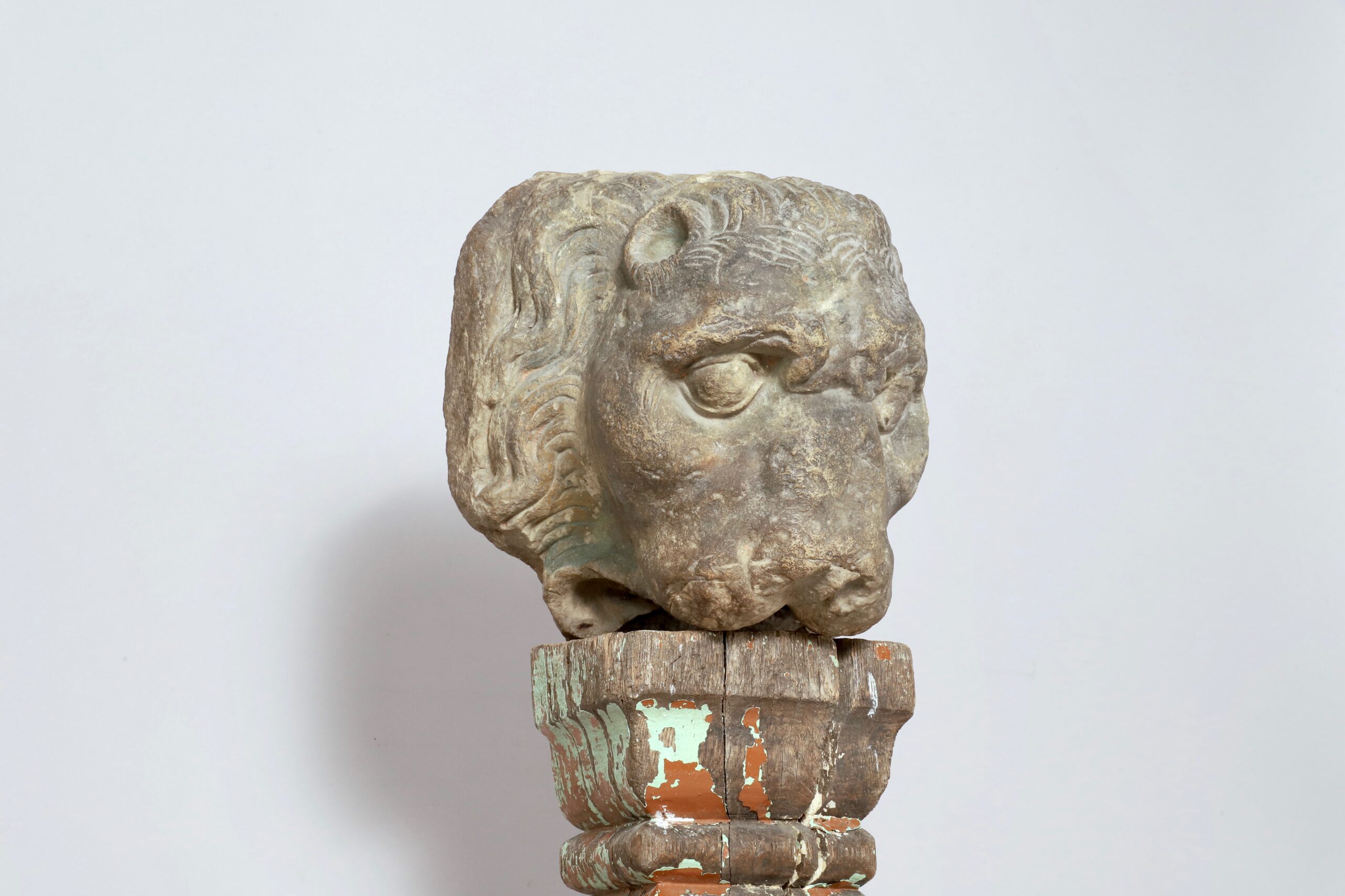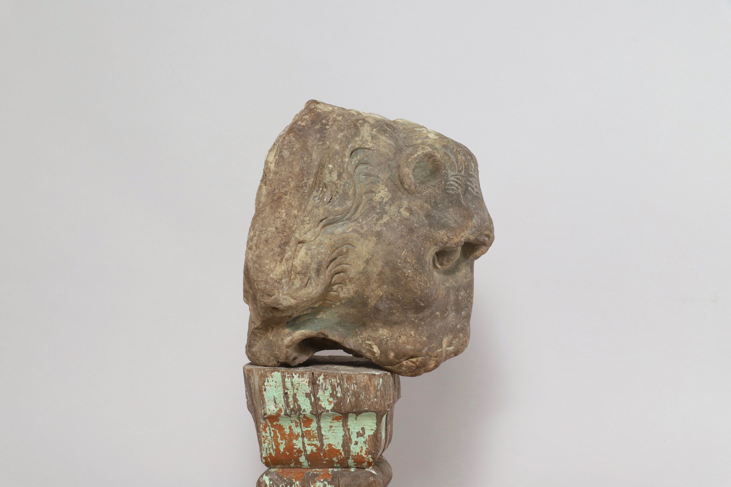 La partie plate à l’arrière de son crâne indique que la tête de lion était placée sur un mur.