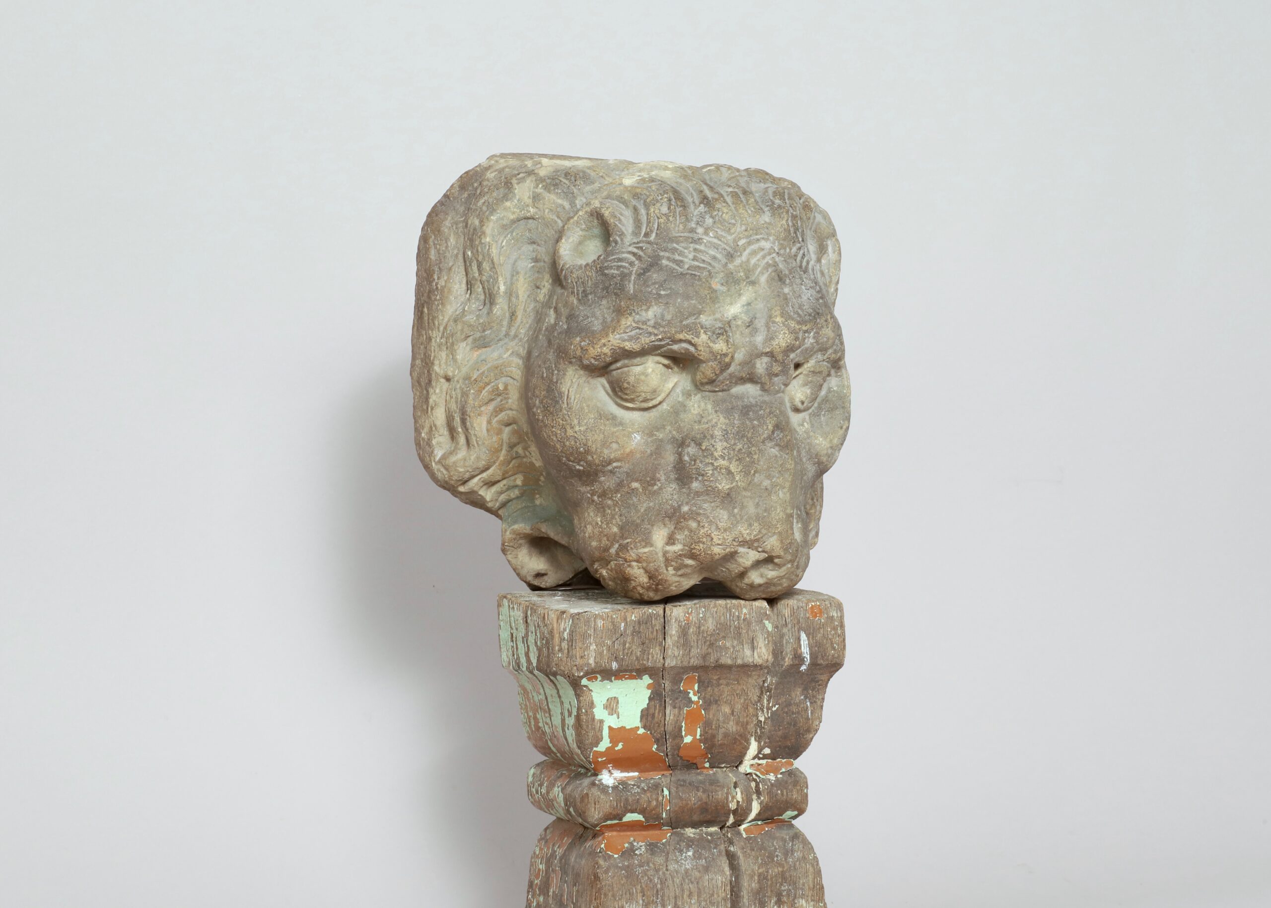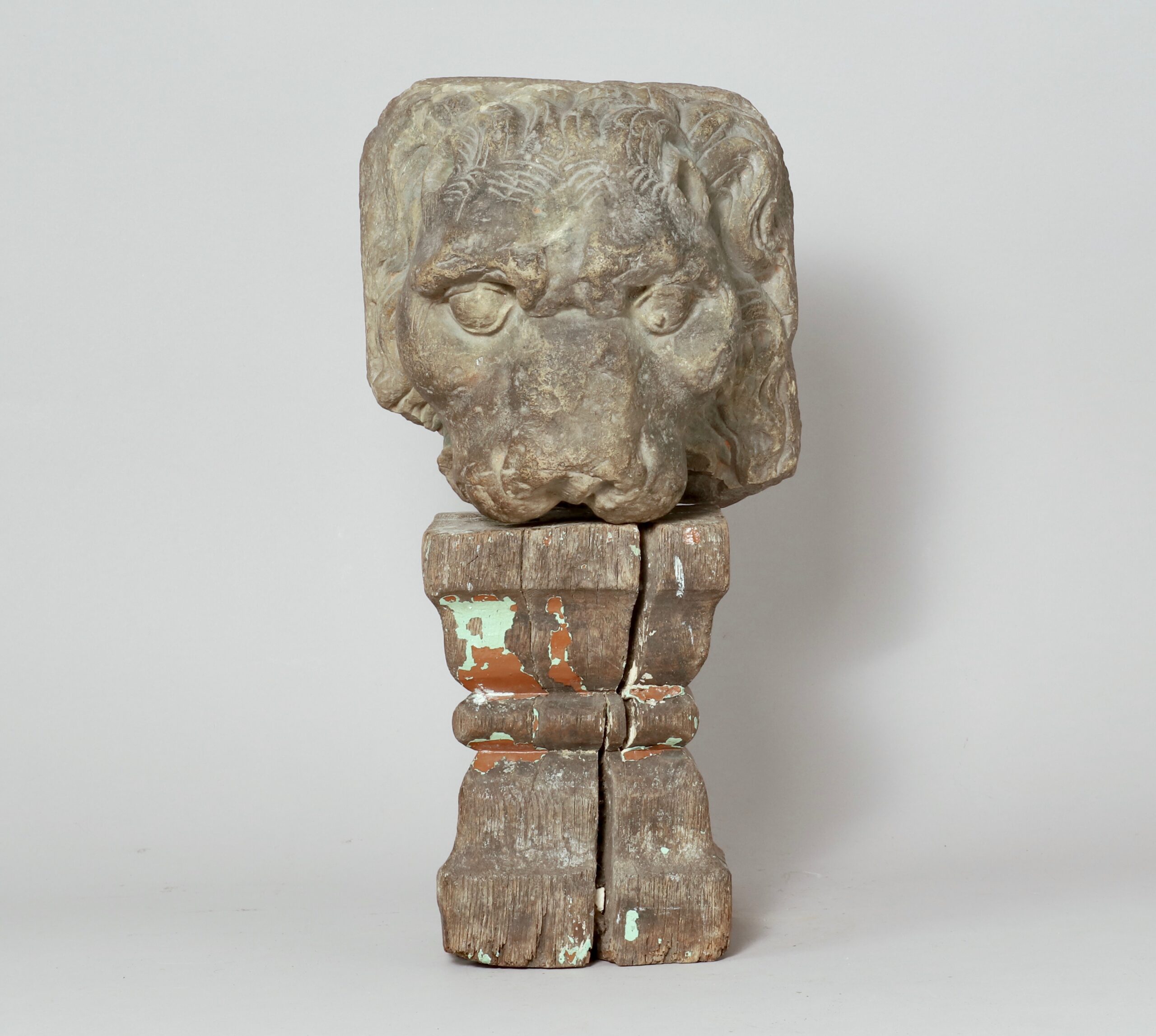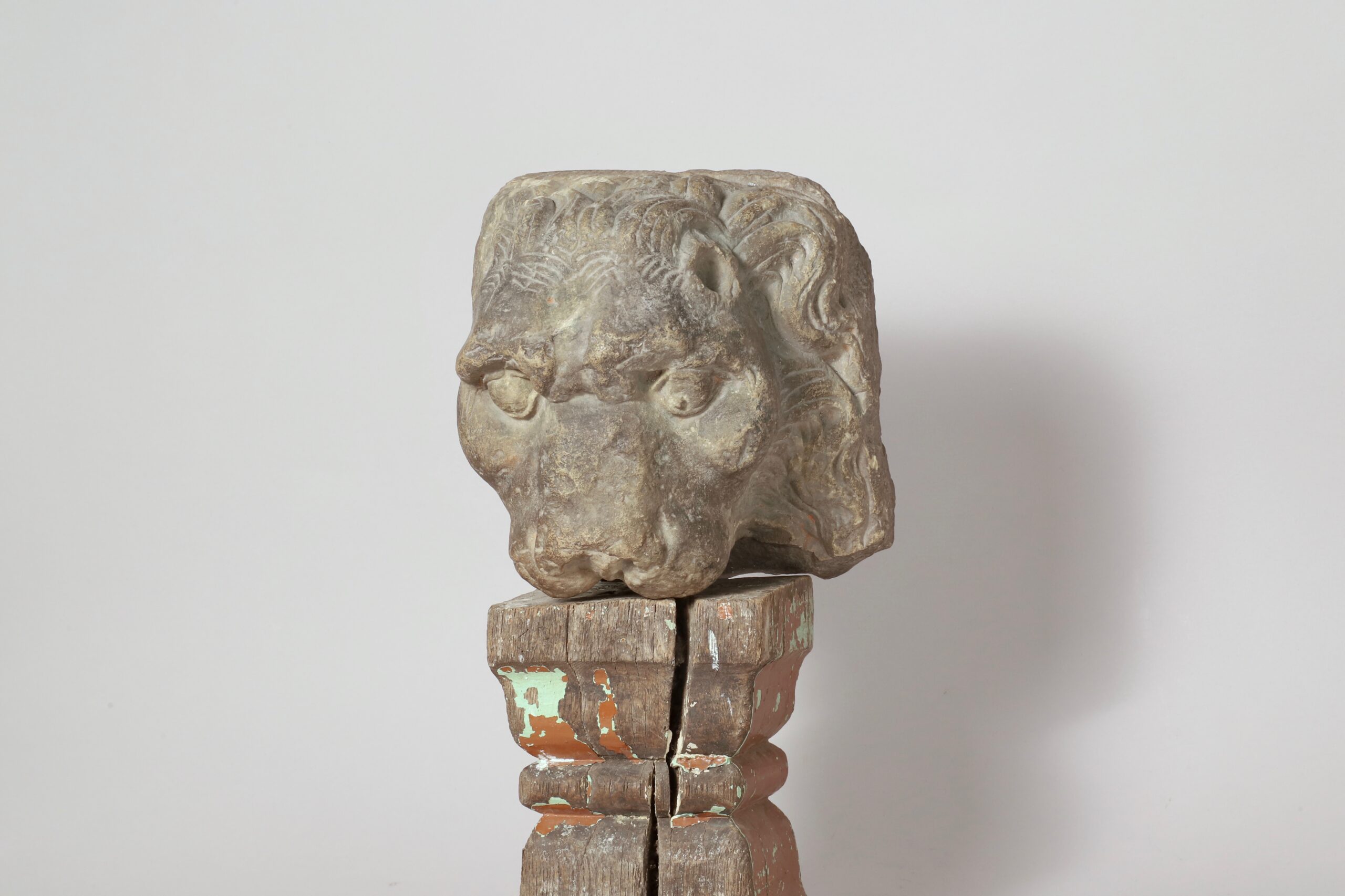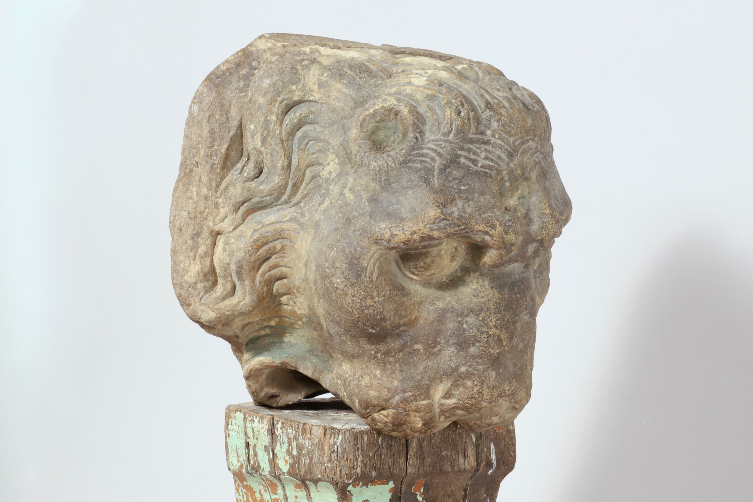 Une tête de lion en grès sculpté datant du XVIIe – XVIIIe siècle. Le visage est accentué par ses babines apparentes ainsi que par son arcade sourcilière qui lui confère un esprit de force et de courage.
