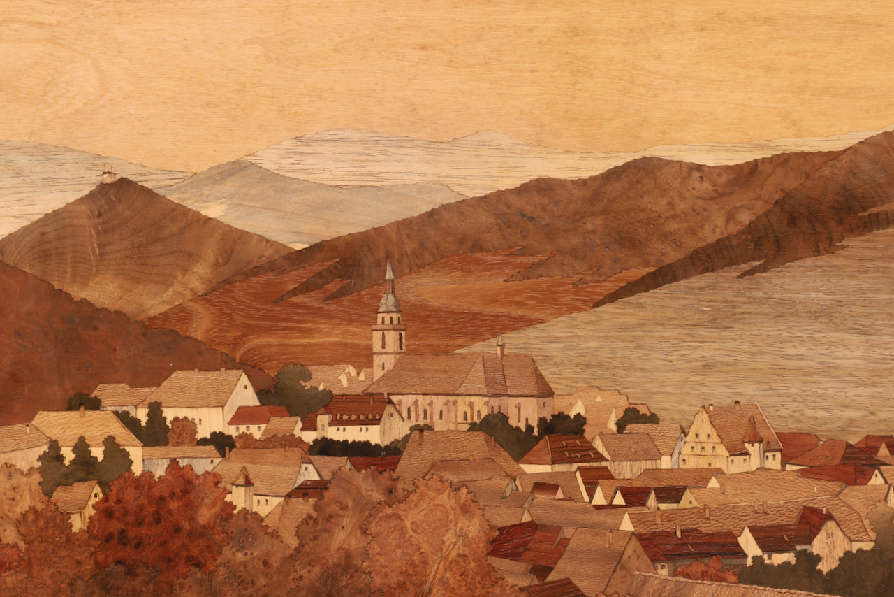 Une marqueterie de Paul Spindler (1906-1980) présentant une vue panoramique de la ville d’Andlau.