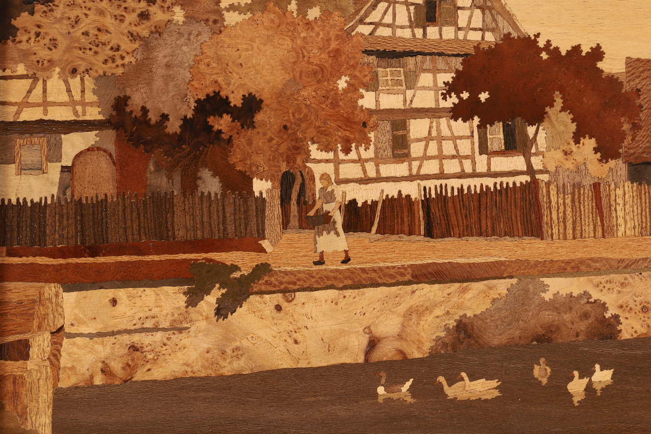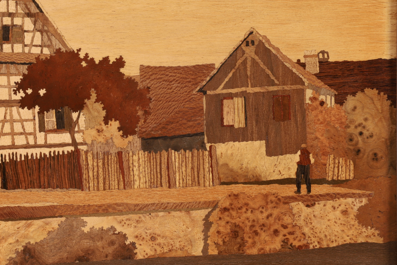 Une marqueterie de Paul Spindler (1906-1980) présentant une scène de vie à Zellwiller.