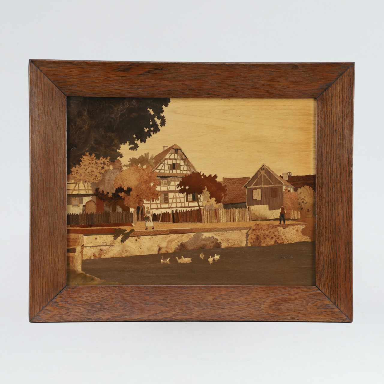 Une marqueterie de Paul Spindler (1906-1980) présentant une scène de vie à Zellwiller. Une grande bâtisse à colombages domine la rive de l’Andlau où un groupe de canards barbote.