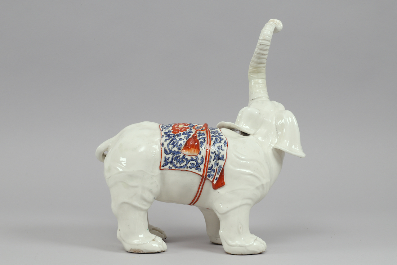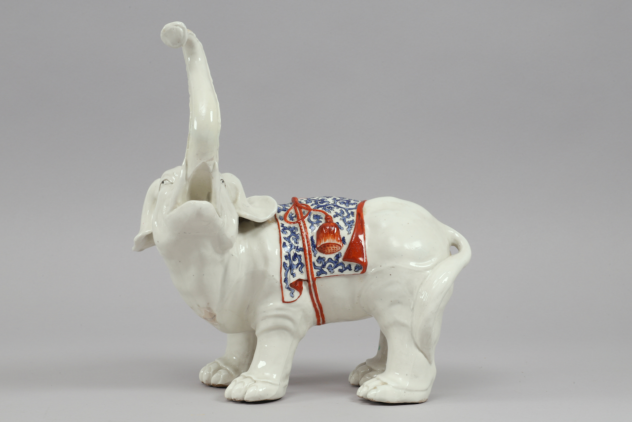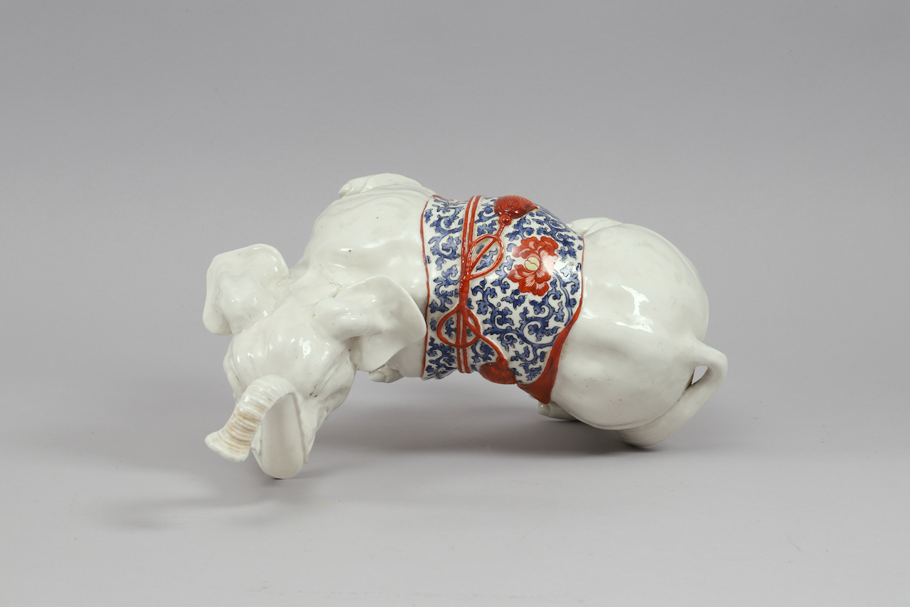 Un éléphant en porcelaine réalisé par la Manufacture Samson durant la seconde moitié du XIXe siècle, d’après un modèle venant de Arita (Japon) ou dans le goût de Chantilly.