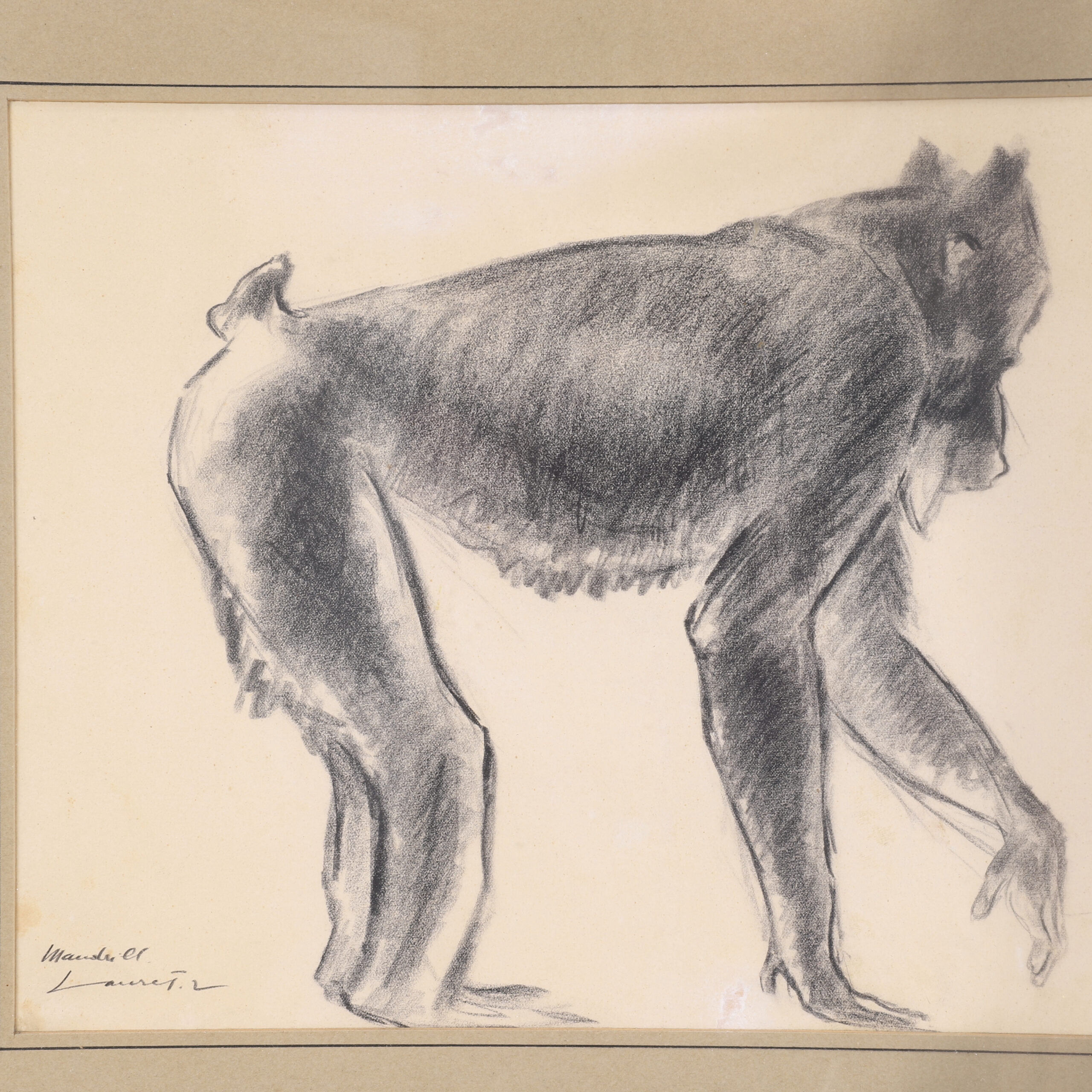 Un dessin au fusain réalisé par Robert Lauret (1902-1969) dans les années 1930. Il s’agit d’un Mandrillus sphinx, il appartient à la famille des cercopithecidés. Il est en train de se déplacer sur ces quatre membres.