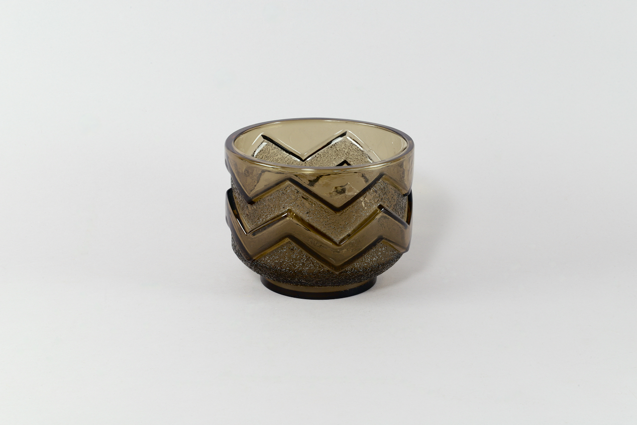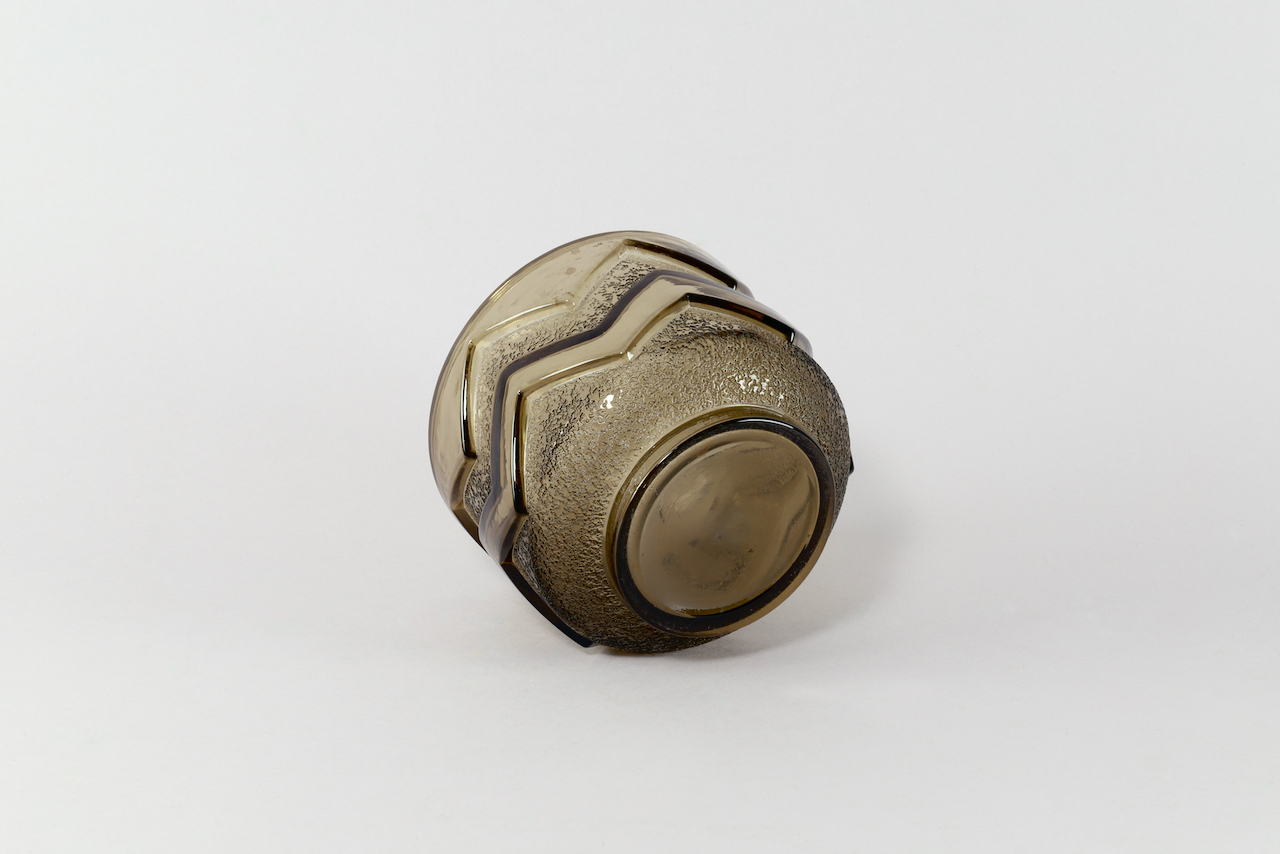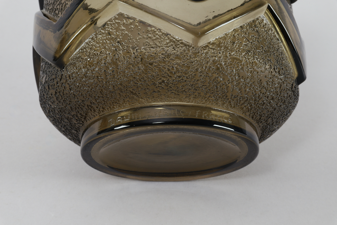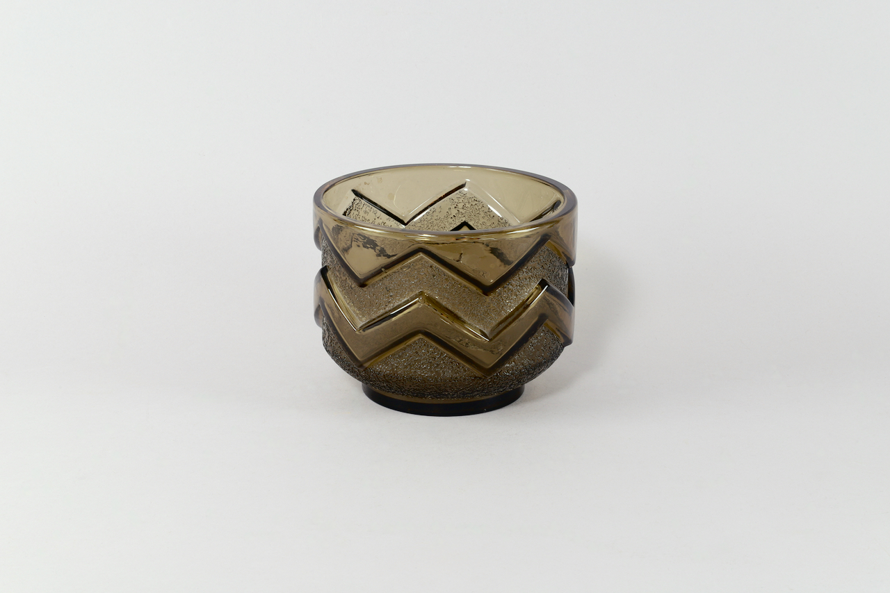 Un vase ou cache-pot en verre fumé de Daum de style Art déco. Le décor, façonné à l’acide, présente des frises en chevrons jouant sur une alternance de surfaces lisses et granitées.