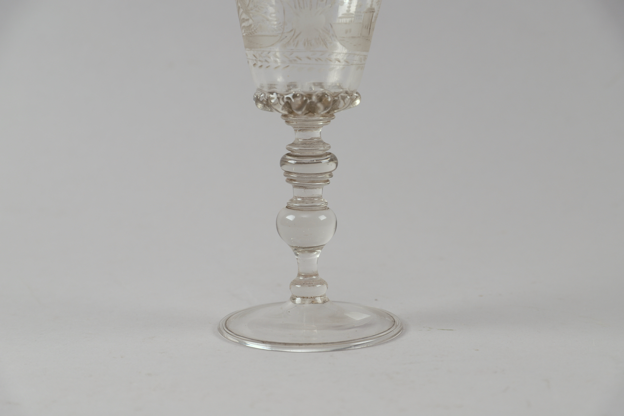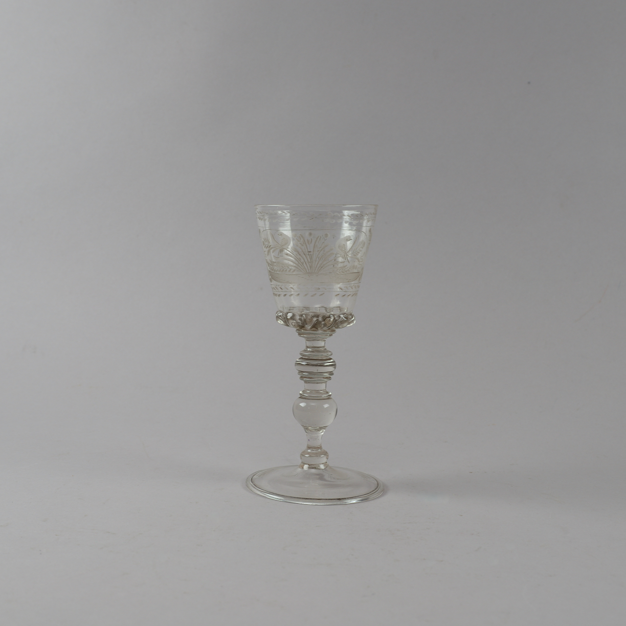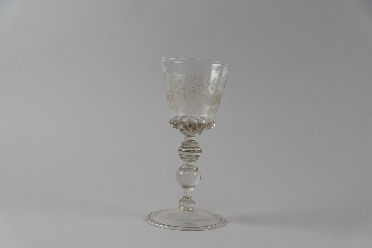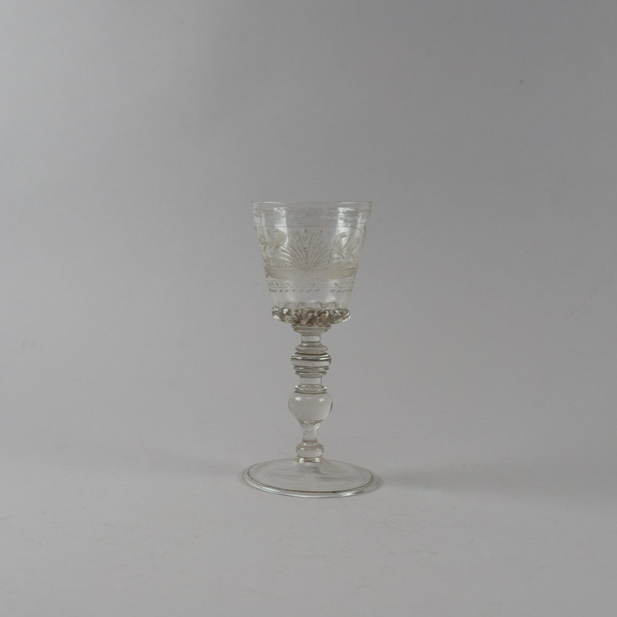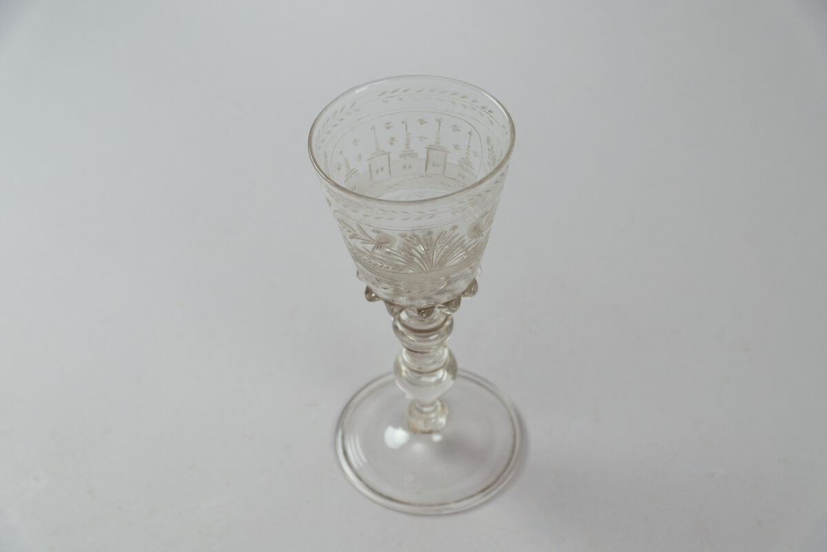 Un verre à vin sur pied gravé avec un décor luxuriant présentant deux frises végétales sur les parties haute et basse du gobelet. Sur la coupe, dans deux médaillons se déploient un paysage avec bâtiments orientalisants et bouquet végétal accueillant deux oiseaux. Entre les ovales, se trouvent des motifs végétaux. La base du buvant est garnie de godrons. Le pied du verre est à multiples renflements.