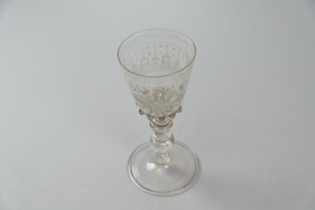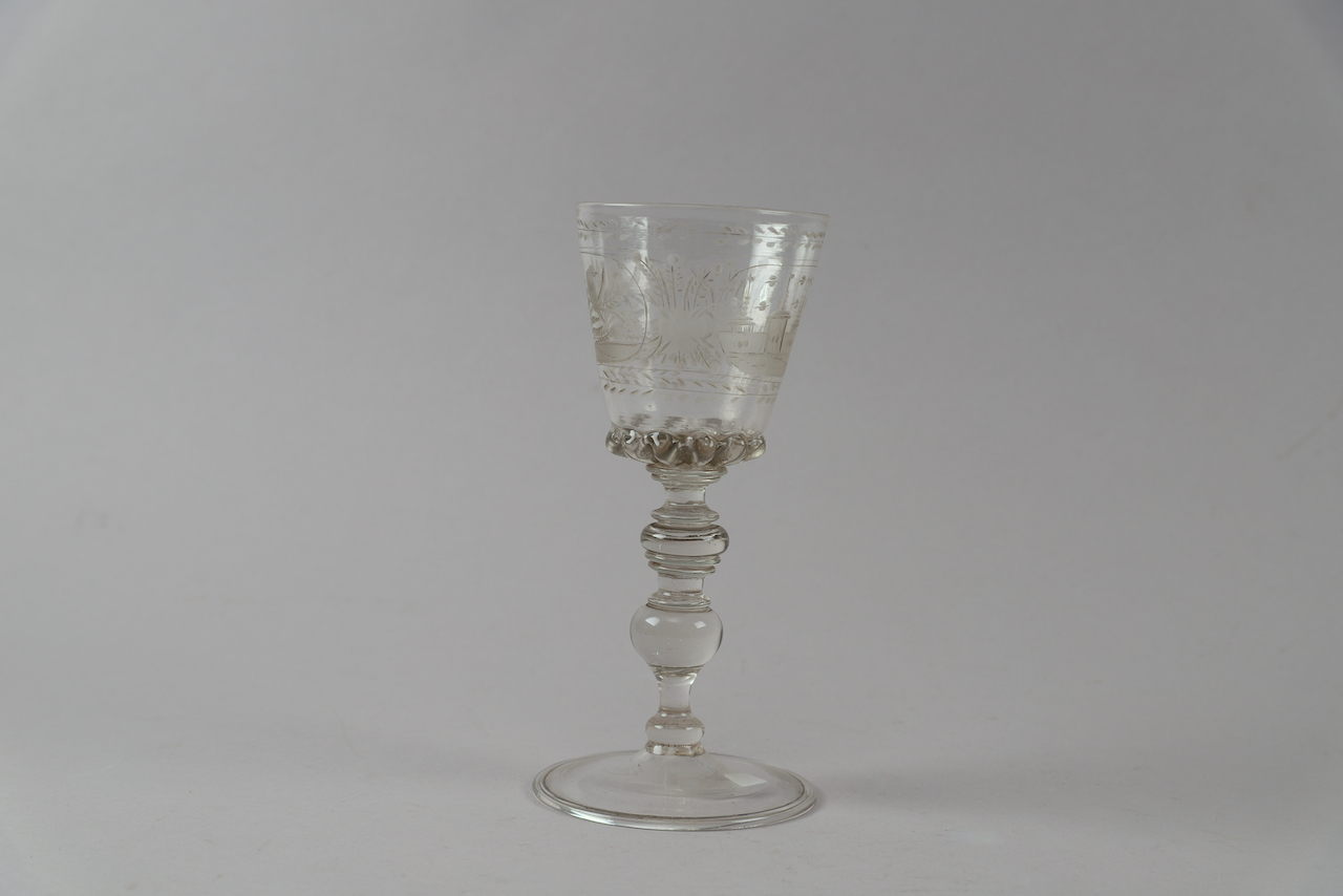 Un verre à vin sur pied gravé avec un décor luxuriant, XVIIIe siècle