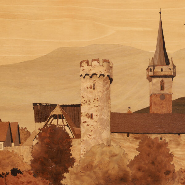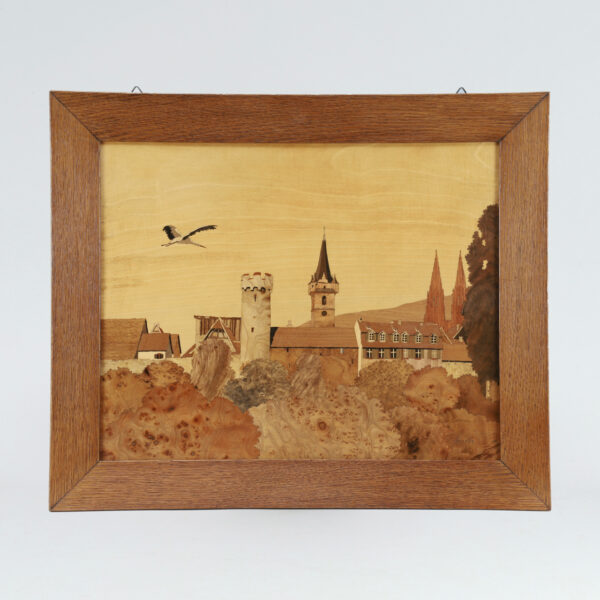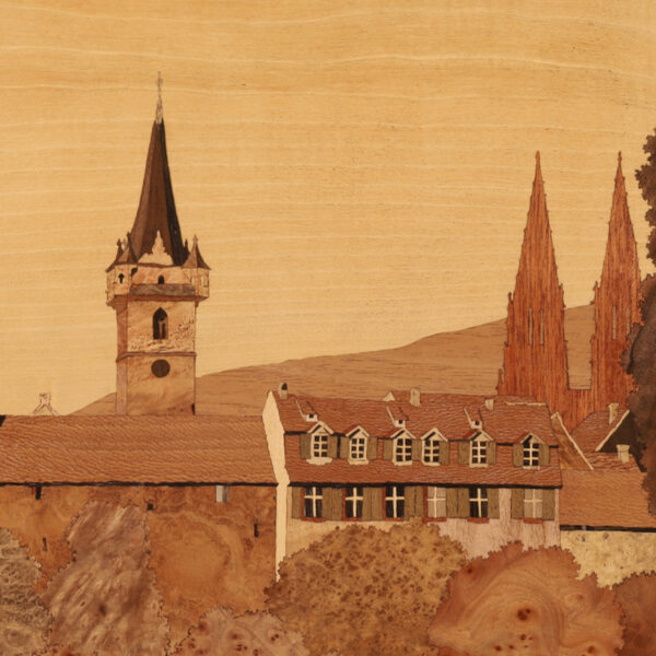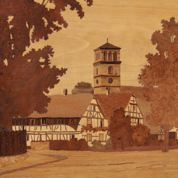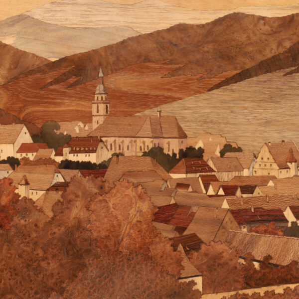Une marqueterie de Paul Spindler (1906-1980) présentant une vue panoramique de la ville d’Andlau.