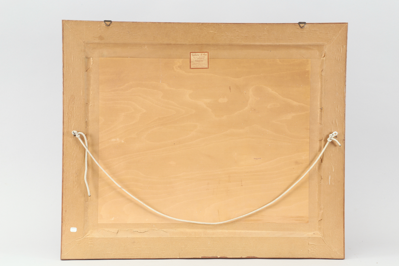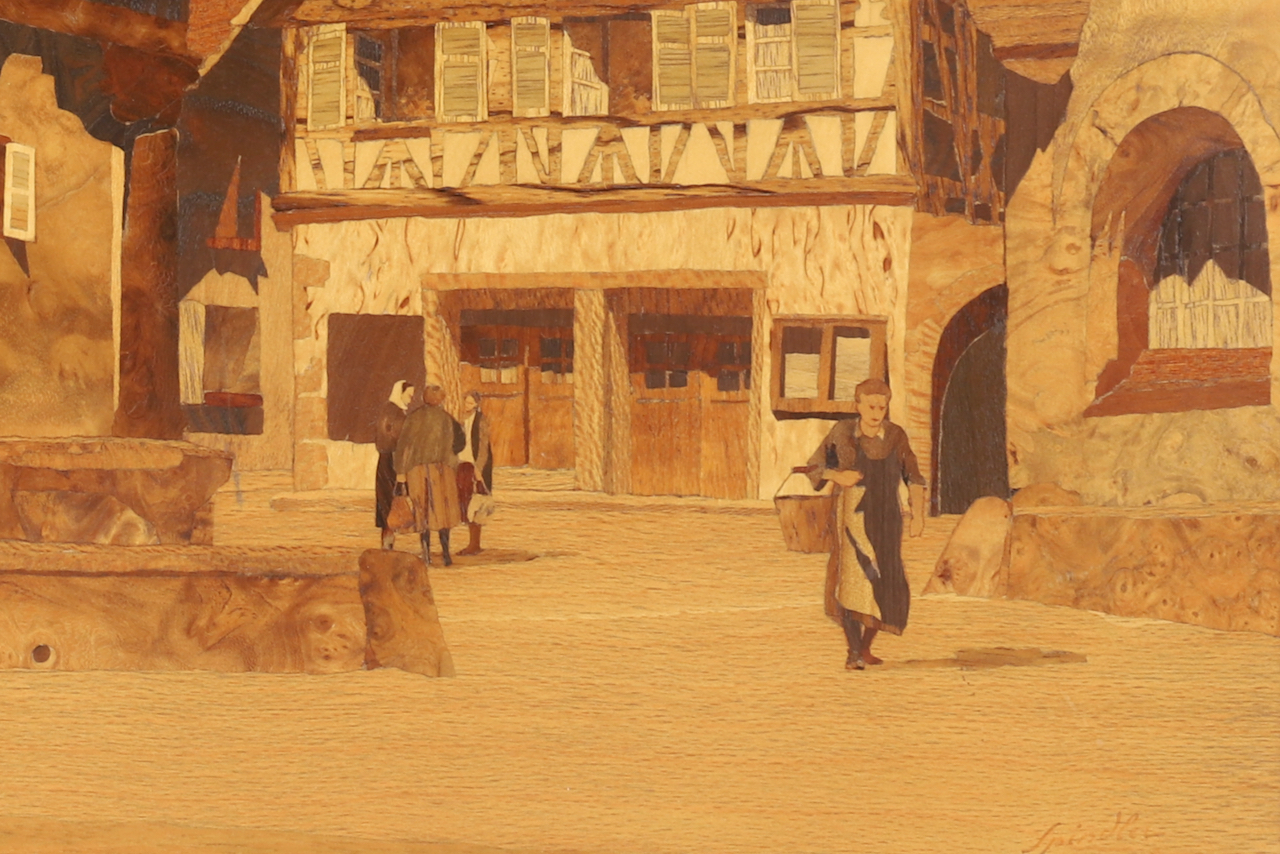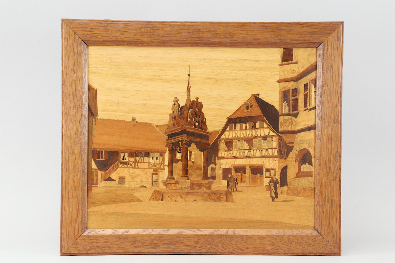 A marquetry by Paul Spindler (1906-1980) presenting a scene of life of the villagers on the Town hall square in Boersch.
