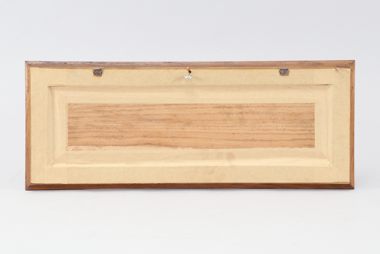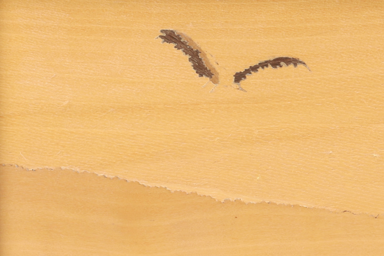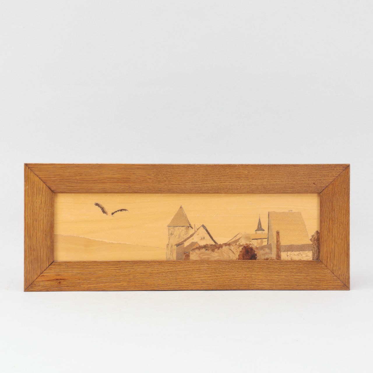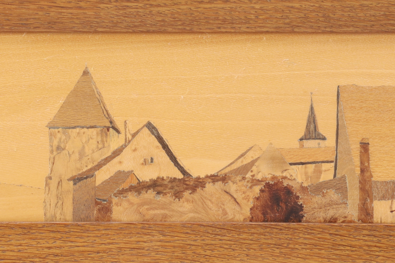 A marquetry by Paul Spindler (1906-1980) featuring the Brand Gate (Oeltor) seen from the side, in the center of the view, the bell tower of Saint Anne’s Church. On the left, a stork in full flight is heading toward the Vosges in the background.