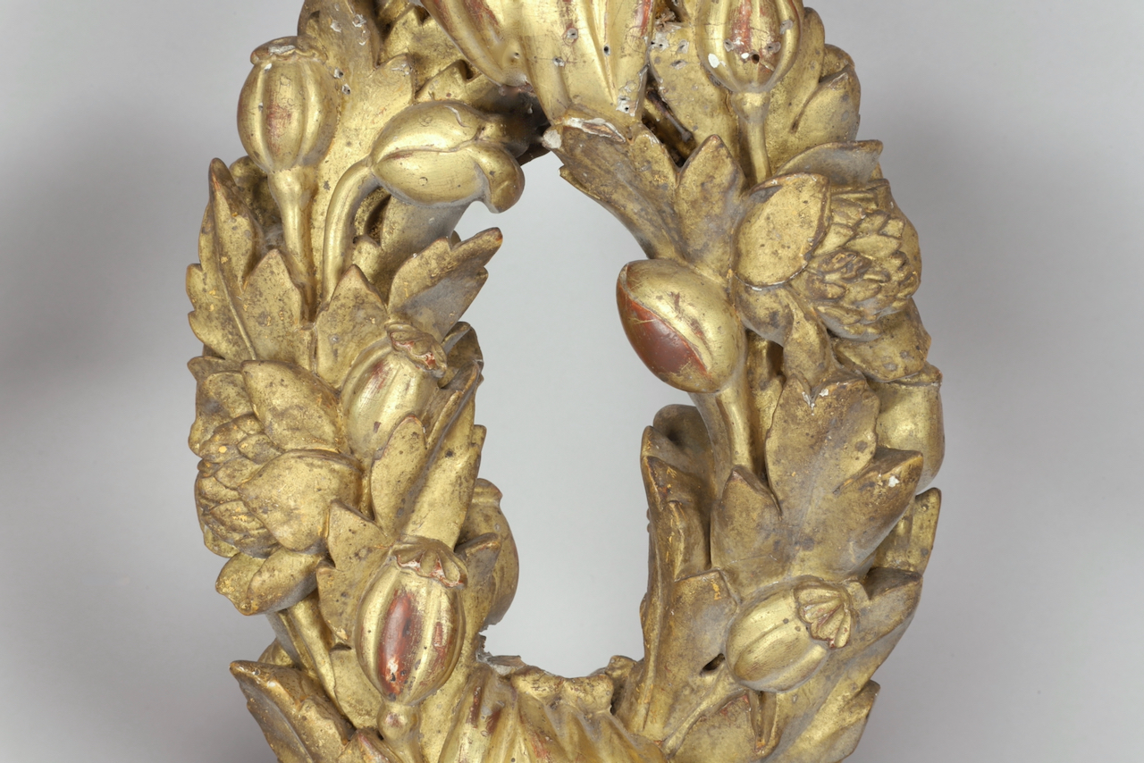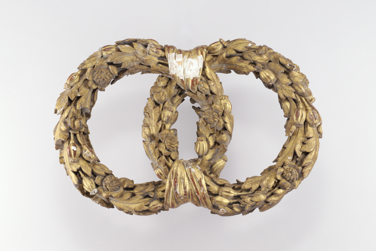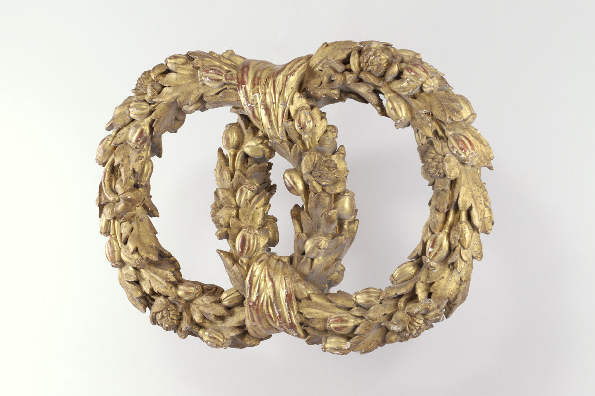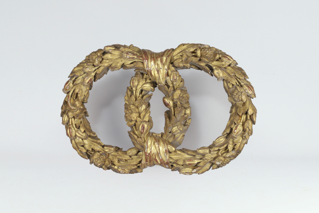 A golden carved wooden garland from the 18th century. This ornament consists of two garlands of intertwined flowers, connected by trompe-l’oeil ribbons. The foliage is embellished with poppy fruits and flowers, a symbol of resurrection and eternal life. The composition in two interlaced rings could also be interpreted as a reference to marriage.