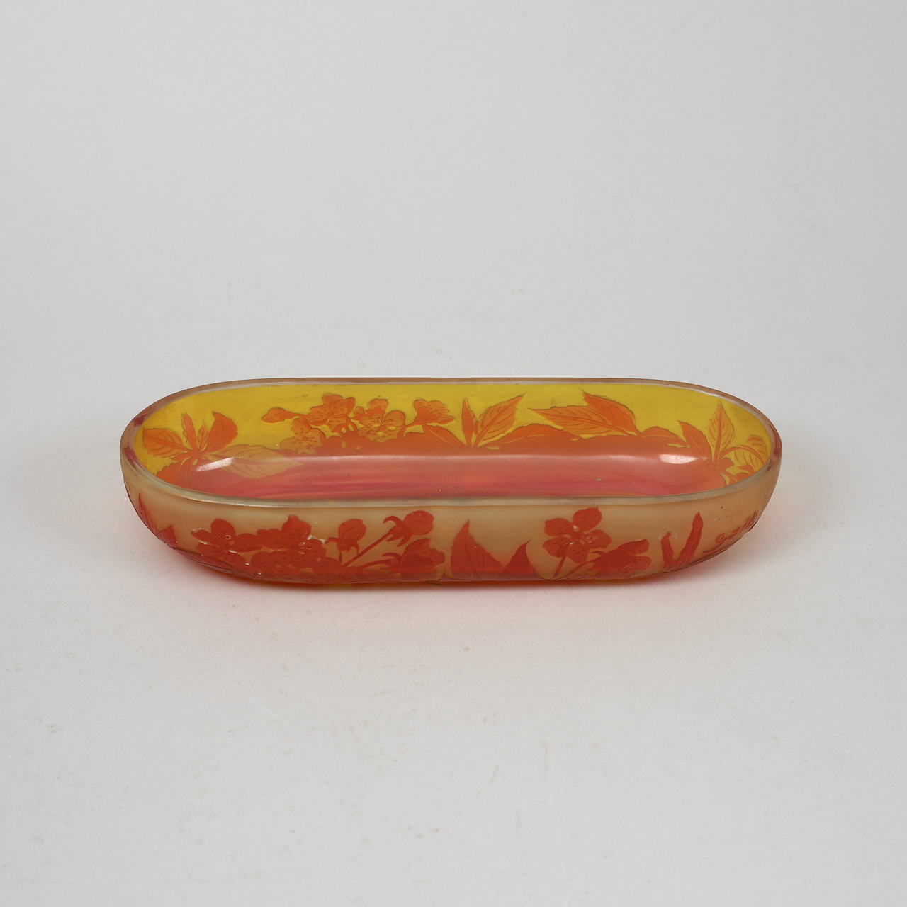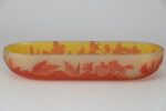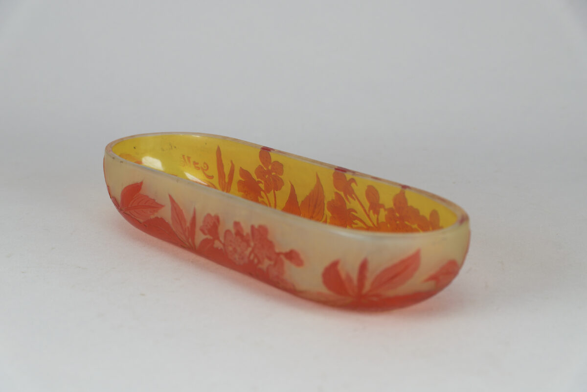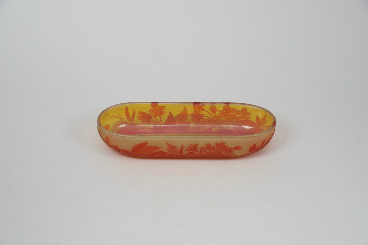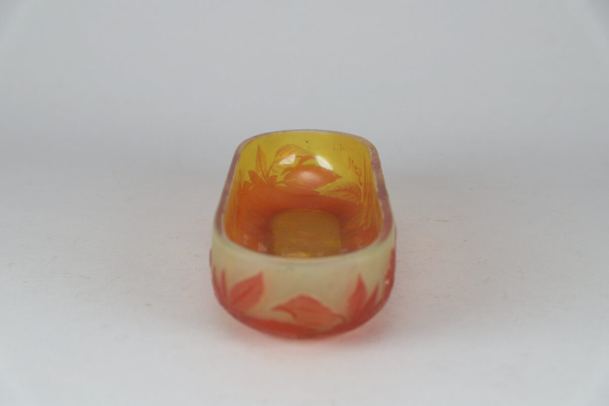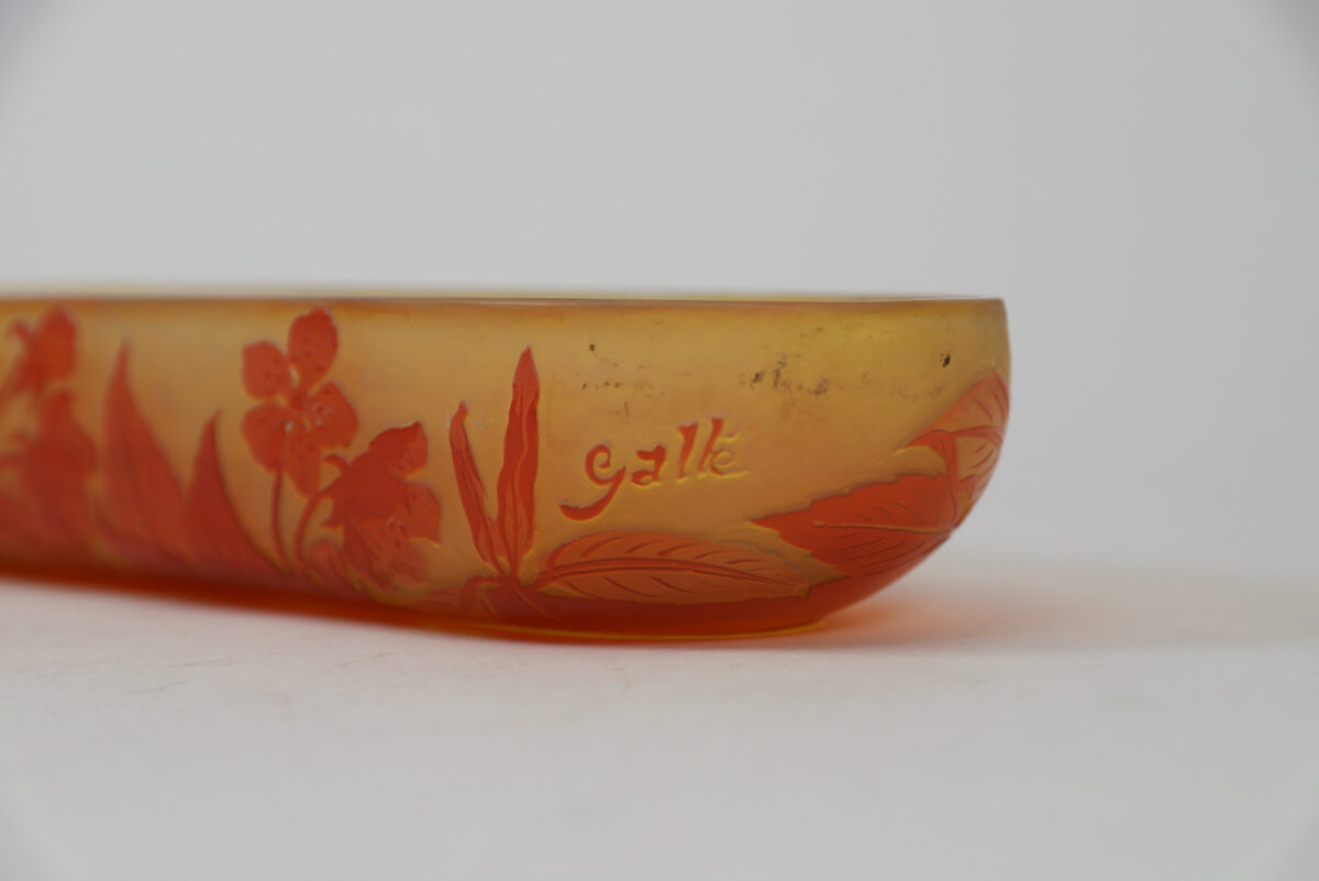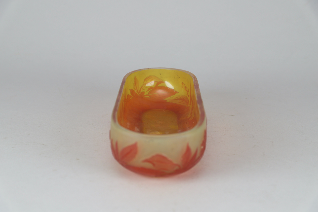 A multi-layered moulded blown glass “vide-poche” with yellow, orange and reddish highlights, with vegetal decoration composed of leaves and apple blossoms obtained by the acid-etching technique. The “Vide-poche” bears the stylized signature « Gallé » in relief on the bottom right.