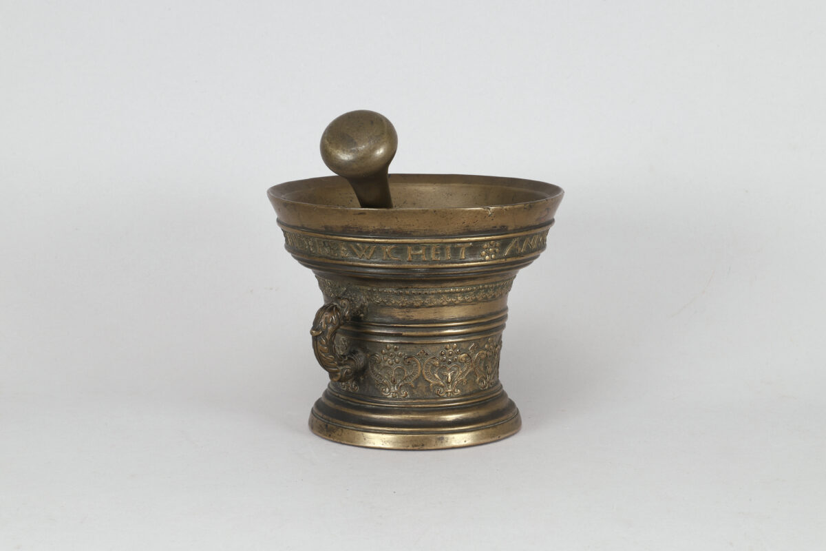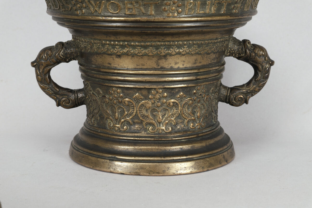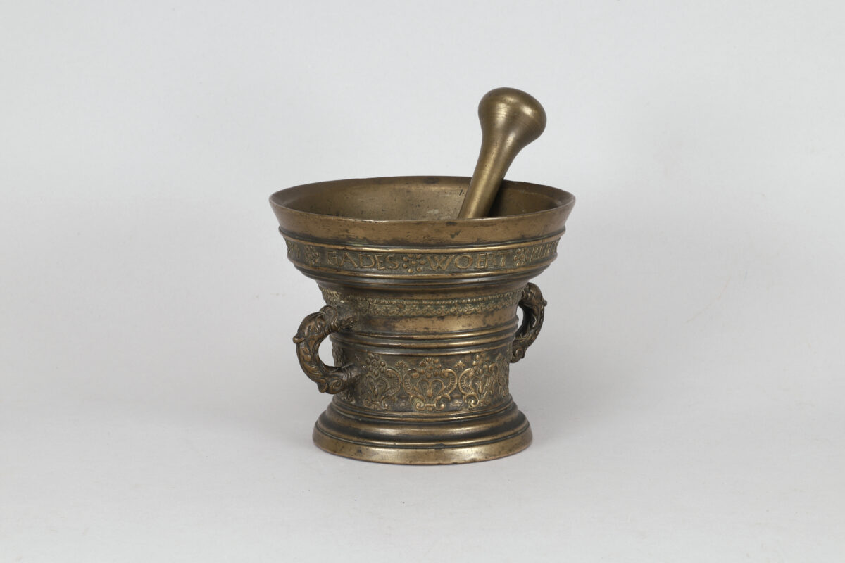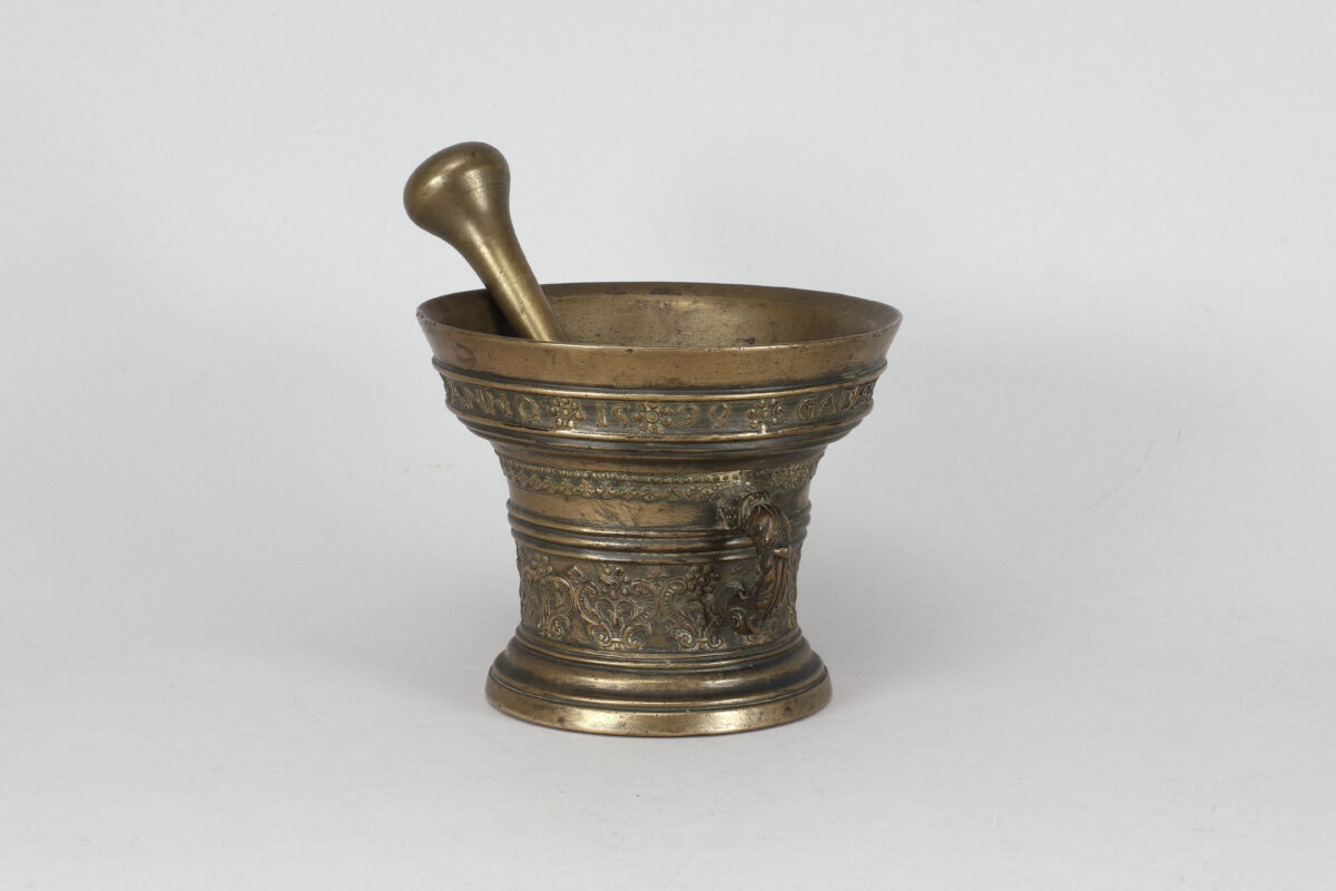 A mortar in bronze with two handles and one pestle made in the Netherlands in 1599.