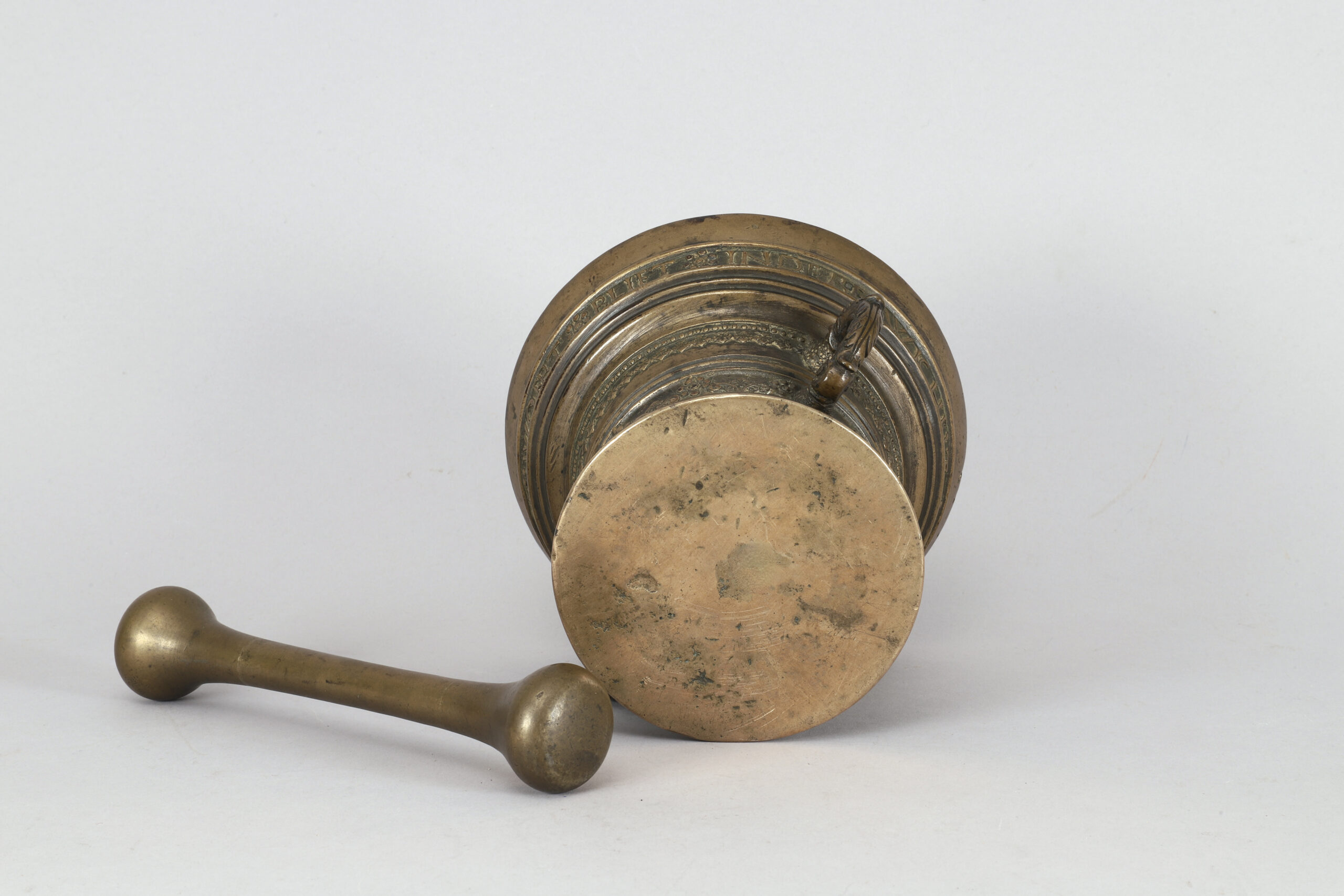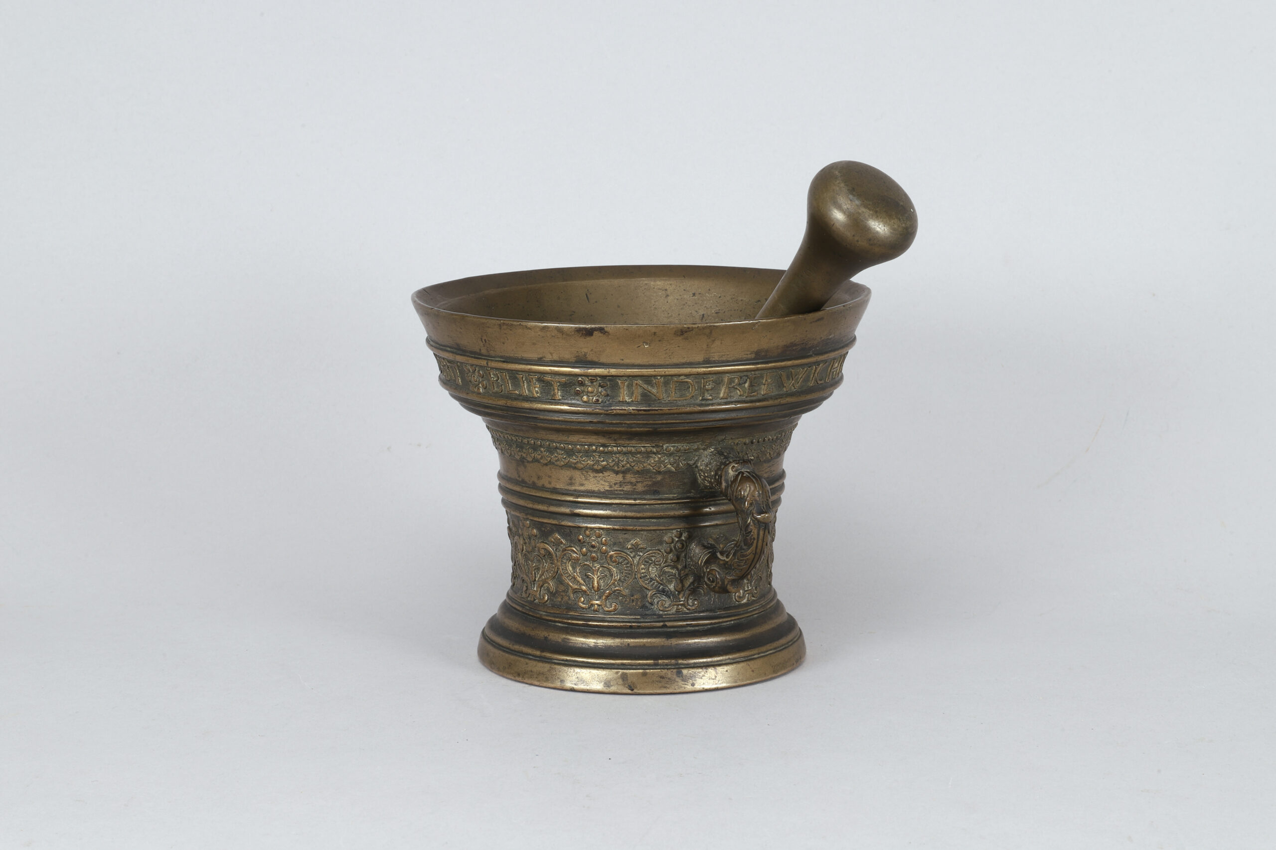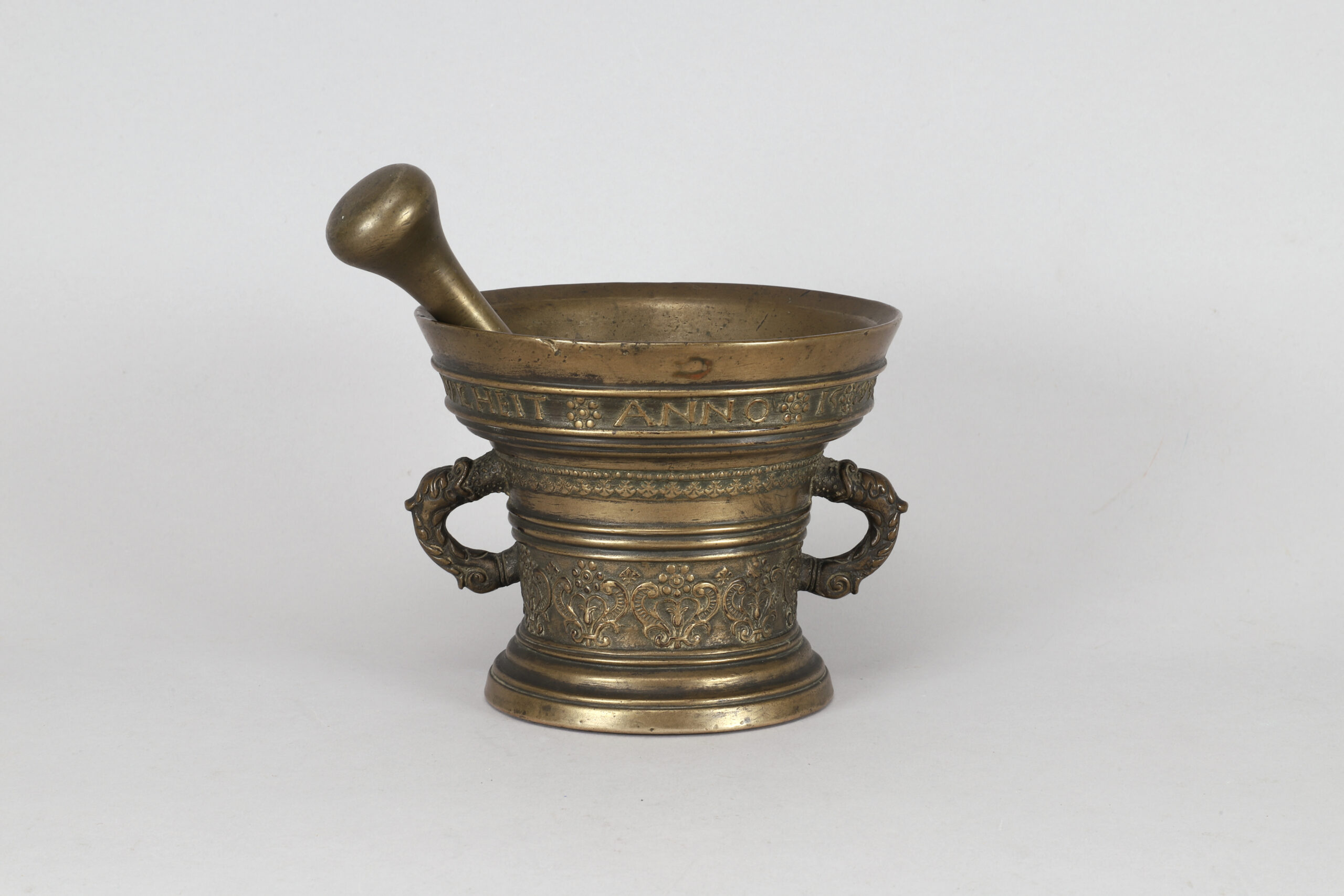 A mortar in bronze with two handles and one pestle made in the Netherlands in 1599.