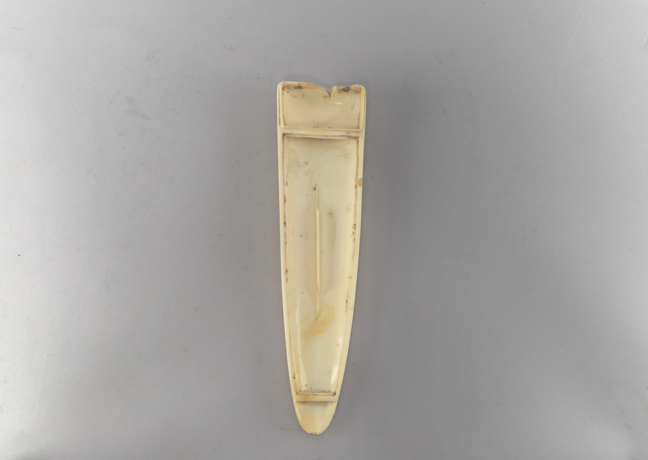 Ivory lid, in the form of a shuttle, a tobacco rasp on which is a carved decoration