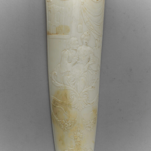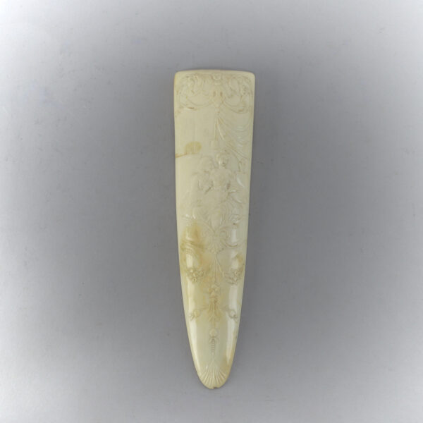 Une couvercle en ivoire de râpe à tabac, forme de navette, bas-relief sculpté.